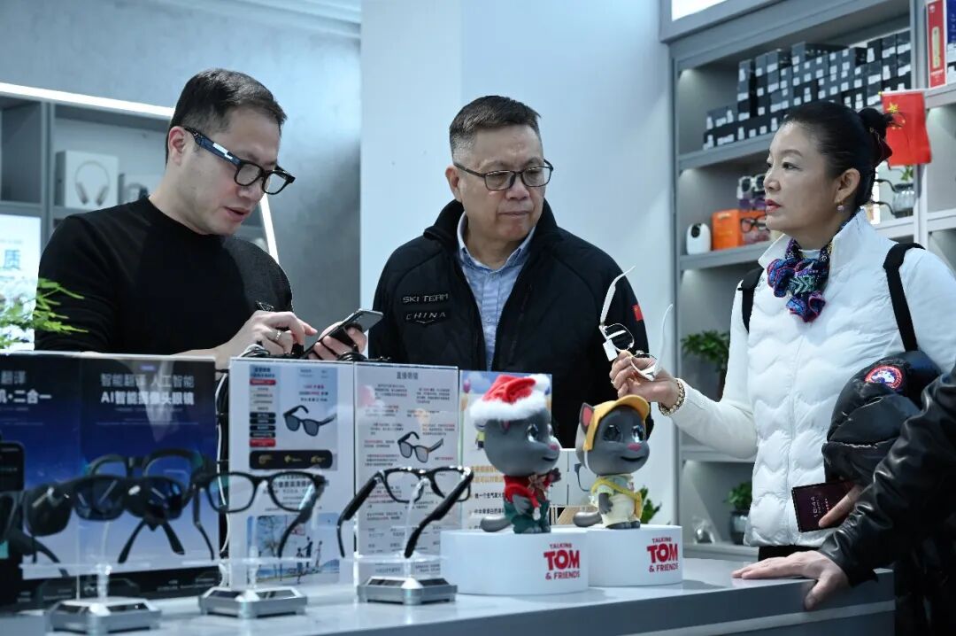 今年1月,客商在浙江全球数贸中心试戴AI智能录像眼镜。吕斌摄