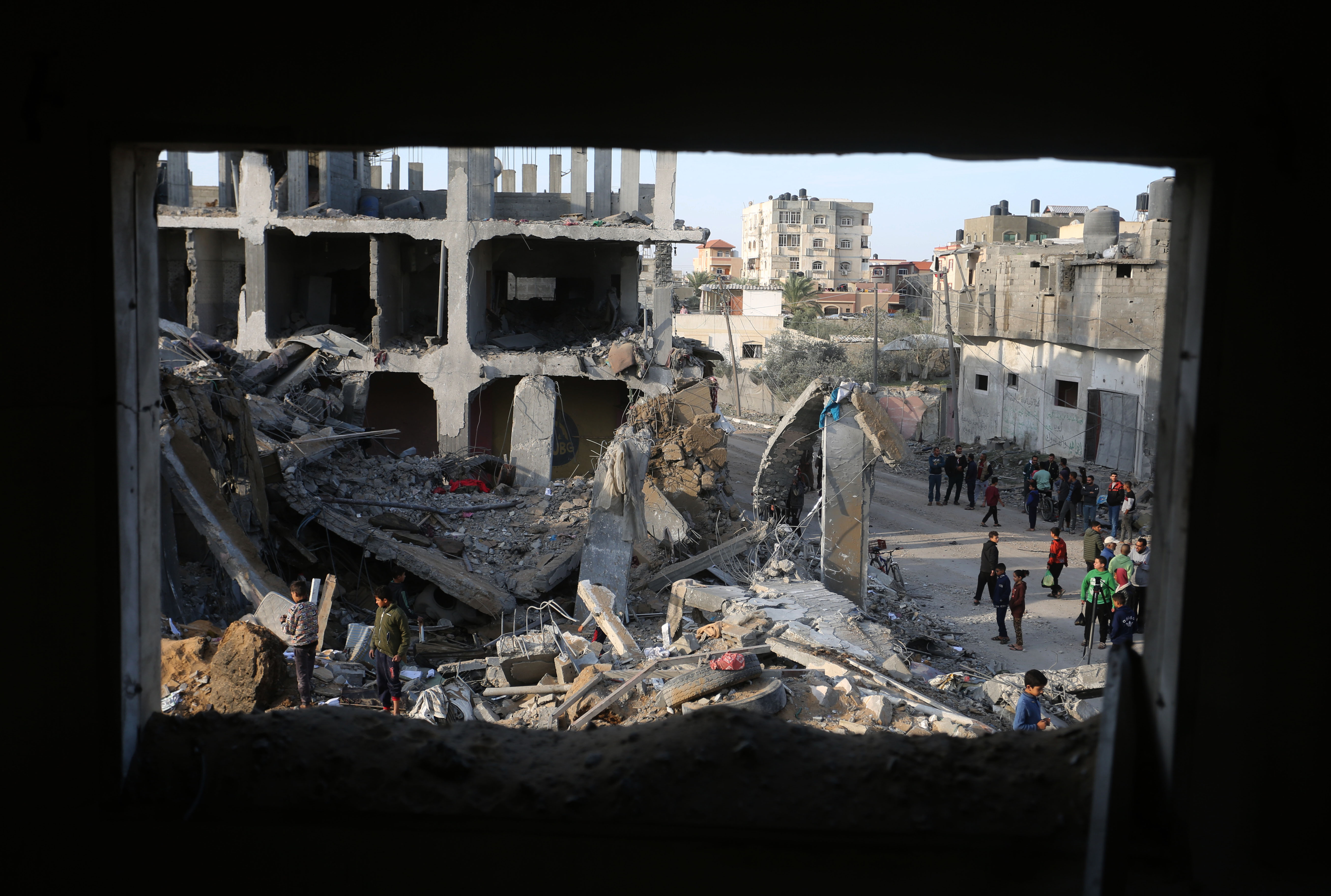 图为12月4日,在加沙地带南部城市拉法,人们查看以军空袭后的住宅废墟。新华社发(哈立德·奥马尔摄)