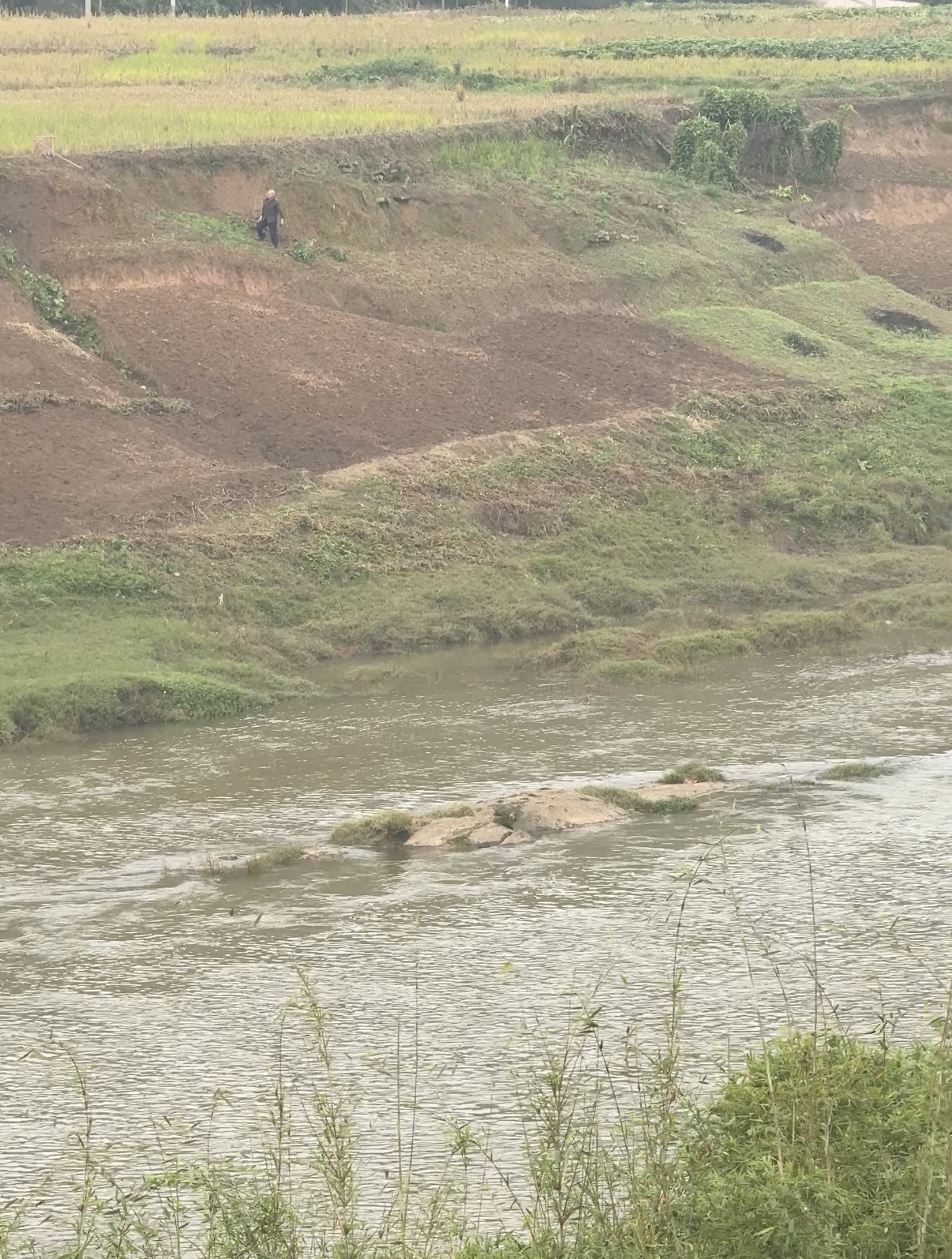 从邻水县城出发约一个小时,司机一路都在踩刹车。数个下坡弯道后,两块荒坡夹着御临河出现在眼前。河中央,一块凸起的、灰白的拱形石头从水面上探出,远远看去,像一个龟壳。“这就是乌龟石。”何泽用手指着说,“现在好多人都专程慕名来打卡。”