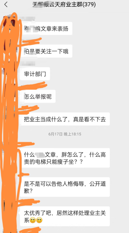 杨女士称,有业主将推文转发到“天恒傲云天府业主群”(该业主群有群员379人),迅速在业主群中传播并引起众怒,众多业主纷纷谴责被告通过官方媒体发布的推文中使用上述词汇明显具有侮辱原告职业、人格的性质。