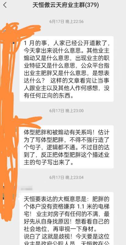 6月17日,杨女士通过他人转发得知,该楼盘开发商于当天上午在其微信公众号发布推文称业主杨女士带人到傲云天府售楼处进行“破坏”,损坏项目物品,并在文中用“职业为个体老板”、“体型肥胖”、“受到其他业主煽动”等语句对杨女士进行形容,发布几个小时后,当天下午5点左右,该推文被发布者删除。