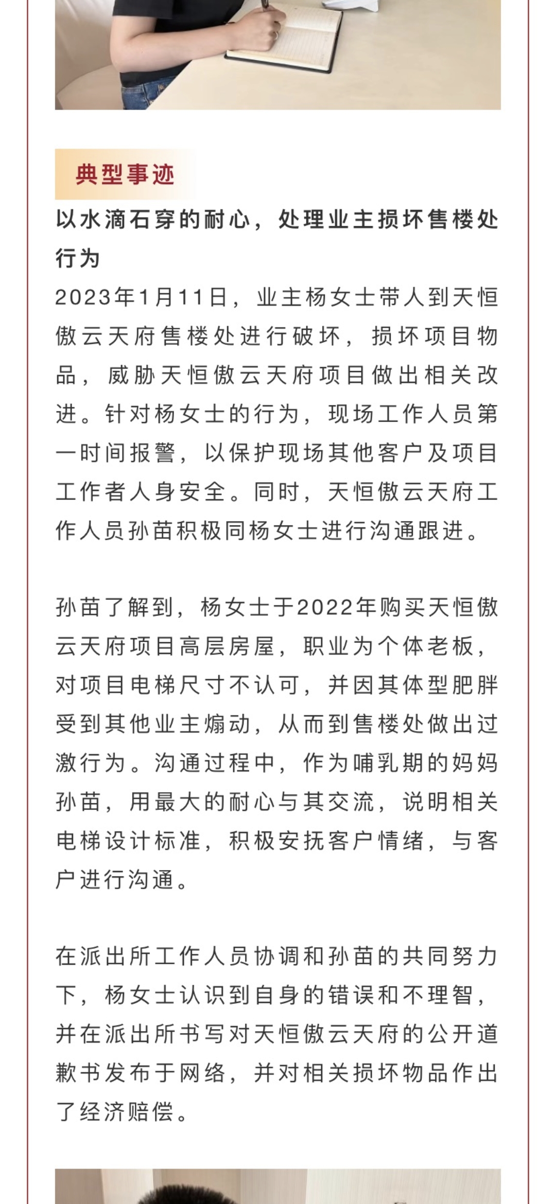 6月17日,杨女士通过他人转发得知,北京天恒置业集团有限公司(该楼盘开发商)于当天上午在其官方微信公众号对外发布推文,称1月11日业主杨女士带人到傲云天府售楼处进行“破坏”,损坏项目物品,并在文中用“职业为个体老板”、“体型肥胖”“受到其他业主煽动”等语句对杨女士进行形容。