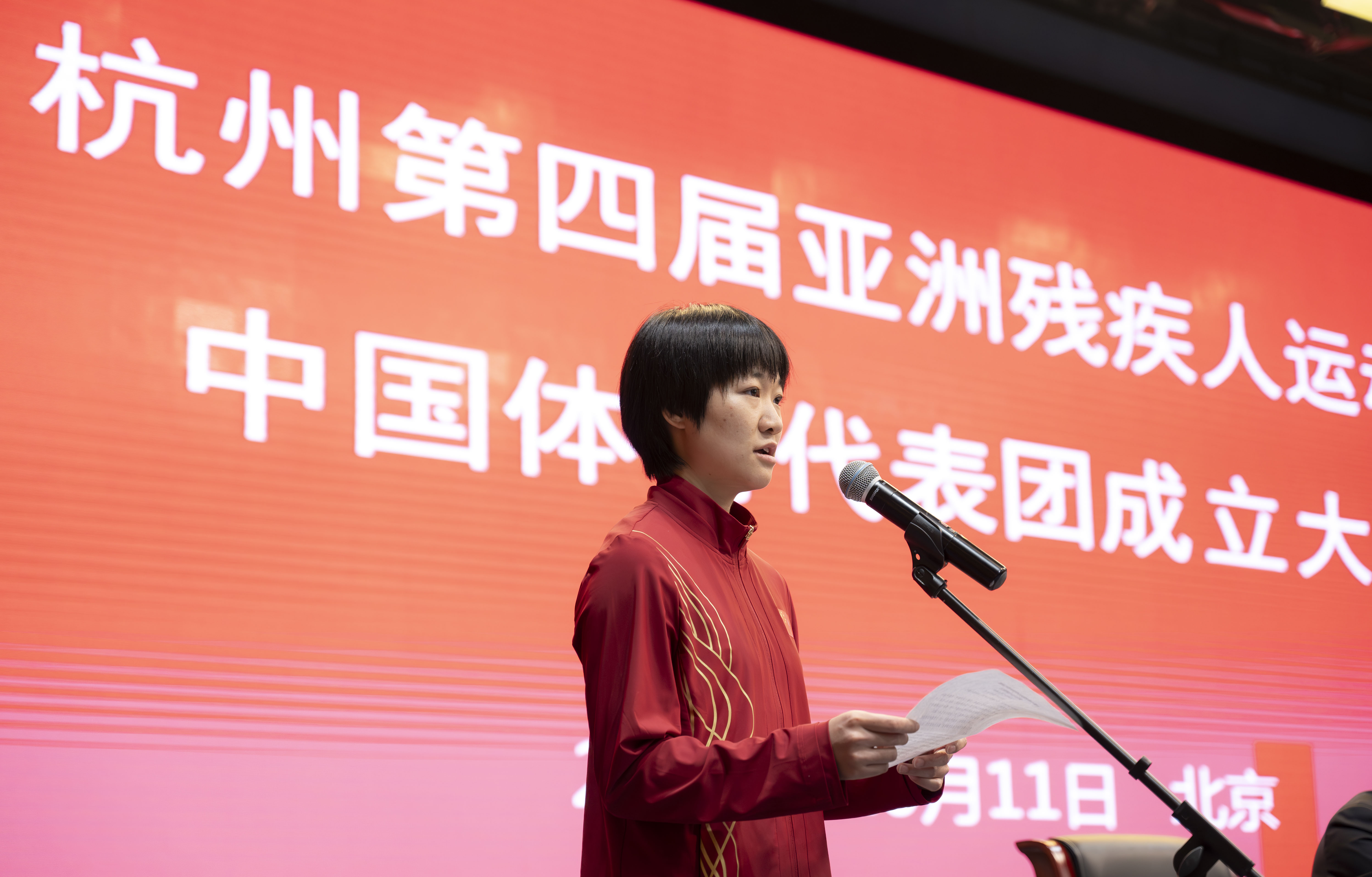 2023年10月11日,运动员代表文晓燕在杭州第四届亚洲残疾人运动会中国体育代表团成立大会上发言。新华社记者 才扬 摄
