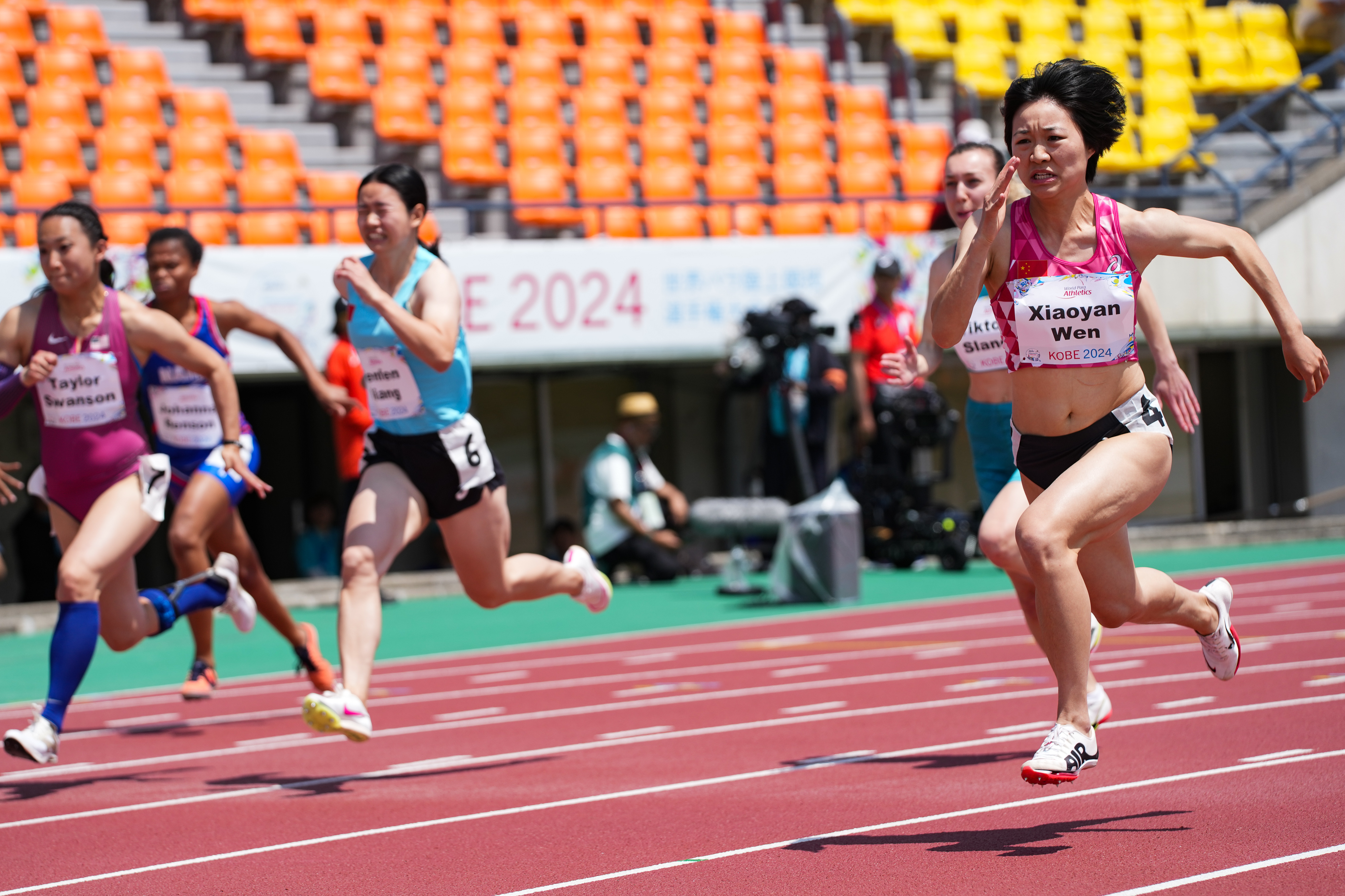 5月21日,中国选手文晓燕(右一)在女子100米T37级别决赛中,最终她以12秒27的成绩获得冠军并打破世界纪录。新华社记者 张笑宇 摄