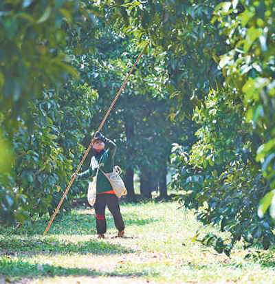 说话间,摘果工人扛着一根顶端带网兜的长竿走过来,用网兜套住山竹,稍一拧竿,果子顺势入网(见图①,本报记者白元琪摄)。这些摘下的果实被整齐地码入果筐中,随后将统一运走。