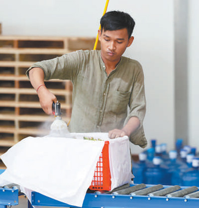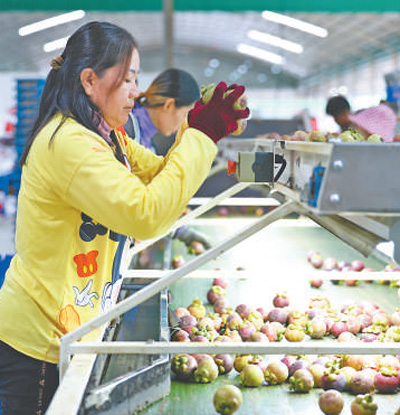 清晨6点,尖竹汶府一家山竹加工厂外,已有不少货车在等待卸货、转运(见图②,本报记者白元琪摄)。加工车间里,巨大的分拣机隆隆作响。分拣机尽头,工人拎起一箱山竹,倒上主送带。分列两侧的10余名挑果员仔细检查着眼前经过的每一颗山竹,熟练分拣(见图③,本报记者白元琪摄):皮色发青的山竹,送入上方传送带,进行汇总装箱,密封后完成催熟流程;品相不佳或个头过小的山竹,被单独放置在边槽内;主送带上的成熟山竹,根据果径大小,被分成5个等级,分别传送到铺着海绵薄垫的包装盒中。分拣工人奈向记者介绍,“这些水果将销往中国。这些年,借助中国的广阔市场,我们产品的销路越来越好”。