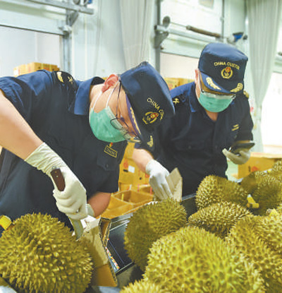 据友谊关海关监管一科科长黄菲菲介绍,为提高进口水果通关效率,友谊关口岸先后设立“榴莲专用通道”和进出口农产品“绿色通道”,并推出智能查验辅助管理系统,“目前,口岸76个查验平台均由系统自动分配,装载进口水果的冷链货车享有优先检查权,大大提升了整体车辆周转率。”