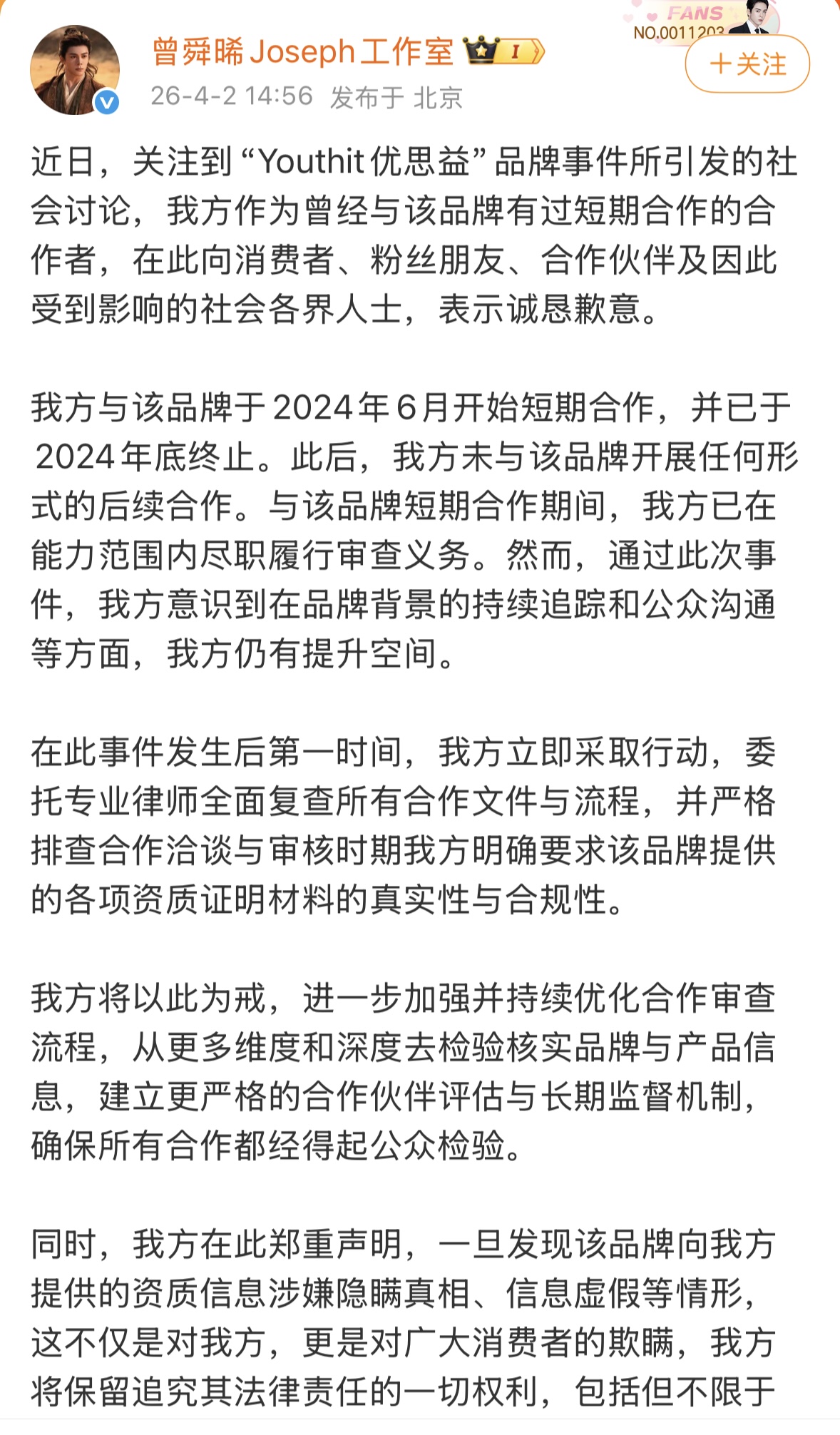 4月2日,曾舜晞工作室对优思益代言事件作出回应,但未提及消费者赔偿事宜。图源微博