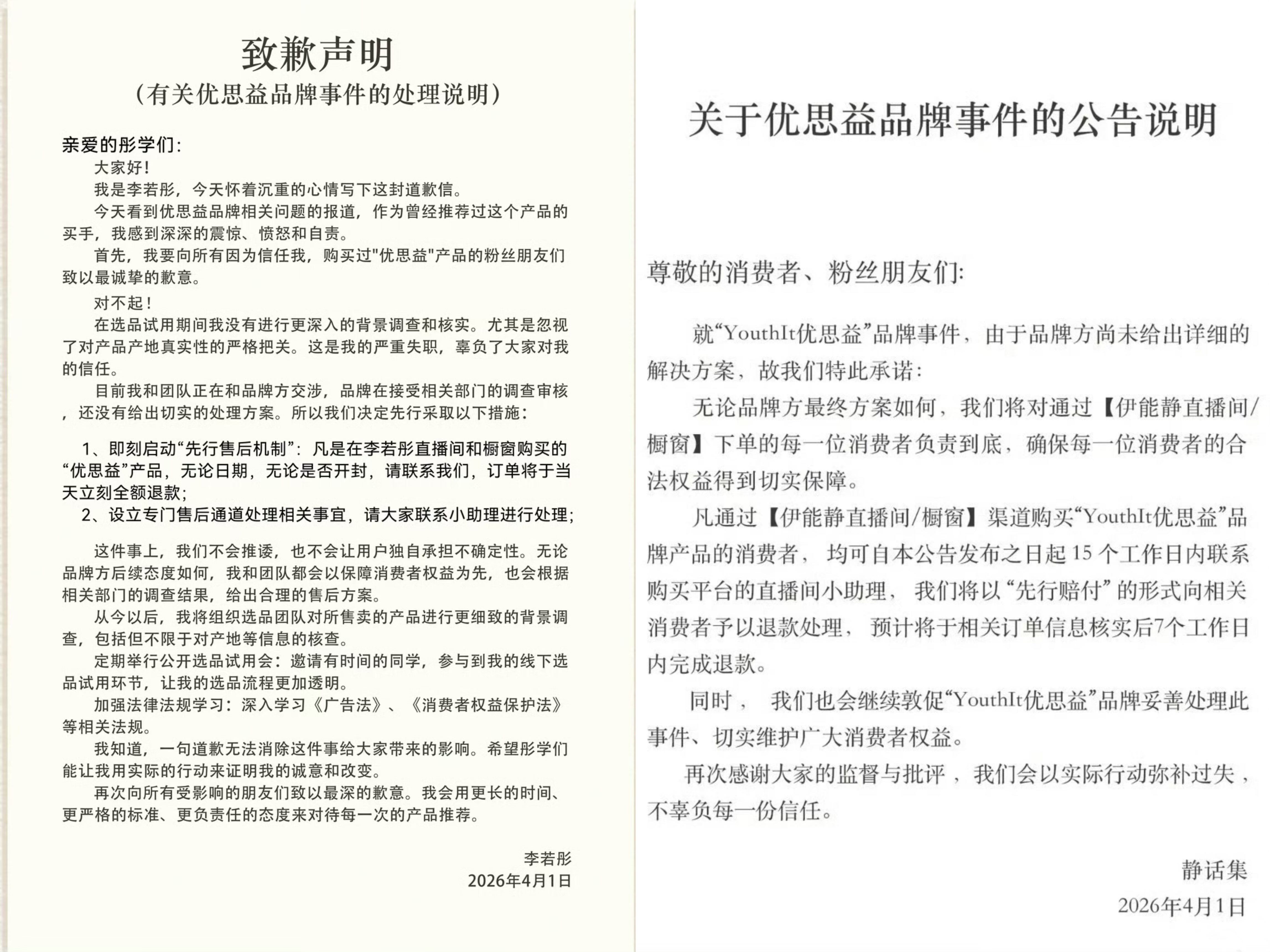 4月1日,李若彤、伊能静发布有关“优思益”的致歉声明。网络截图