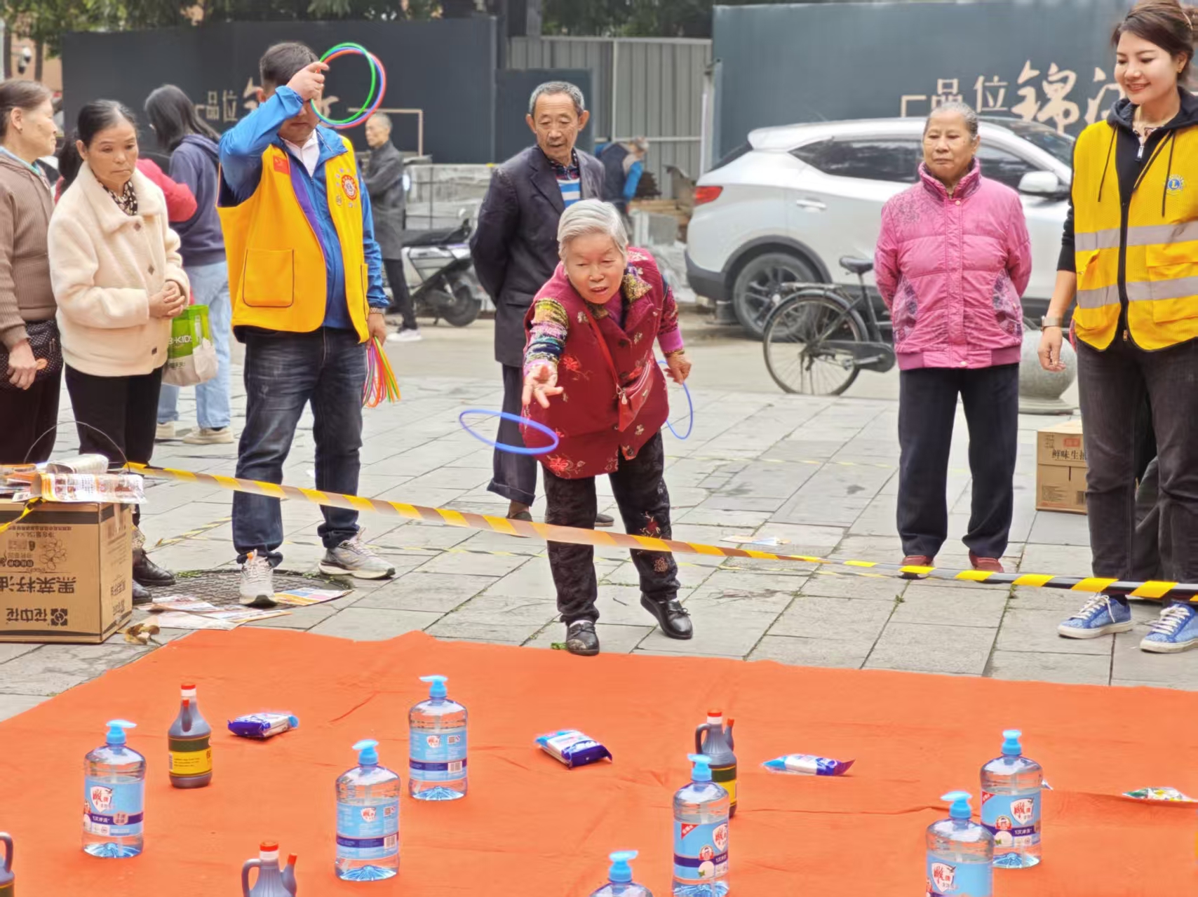 此外,由中国狮子联会四川阳光服务队带来的重阳节趣味活动更是将现场气氛推向高潮。套圈、投壶等适合老年人的游戏项目旁围满了欢声笑语的居民,志愿者们热情讲解规则、发放奖品,老人们的脸上洋溢着幸福的笑容。