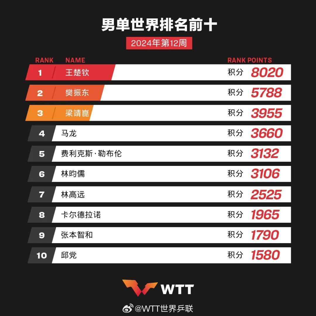 王楚钦的男单世界排名积分增至8020分,此前排名第一的樊振东现位居第二,新加坡大满贯赛亚军梁靖崑排名上升两位来到第三,马龙排名第四,另一位国乒队员林高远排在第七。世界排名前十的运动员还有费·勒布伦(法国队)、林昀儒(中国台北队)、卡尔德拉诺(巴西队)、张本智和(日本队)和邱党(德国队)。