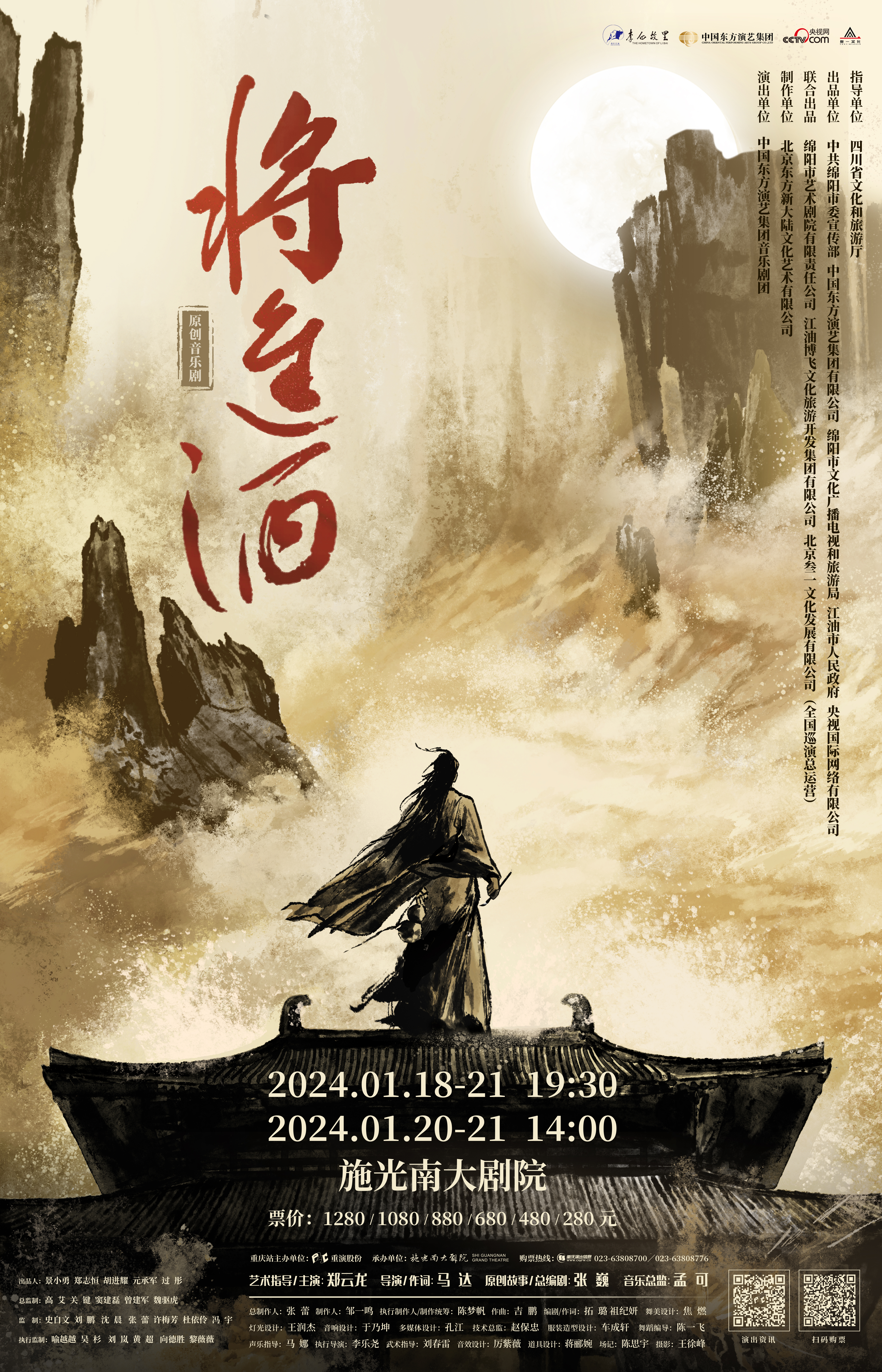 “君不见黄河之水天上来,奔流到海不复回……”2024年1月18日,由郑云龙、李炜鹏、喻越越等主演的原创音乐剧《将进酒》,在重庆施光南大剧院首演,这也是该剧首轮巡演的收官之站。