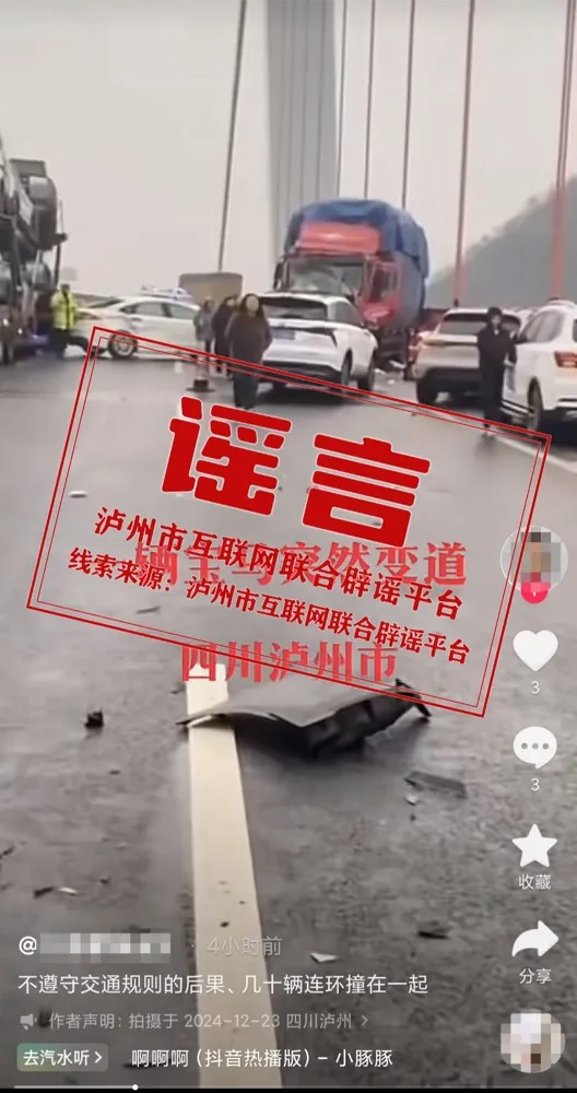 近日,有网民通过短视频平台发布视频称“不遵守交通规则的后果,几十辆连环撞在一起”,并定位“四川泸州”。经泸州市公安局核实:近期泸州市未发生大型连环车祸。