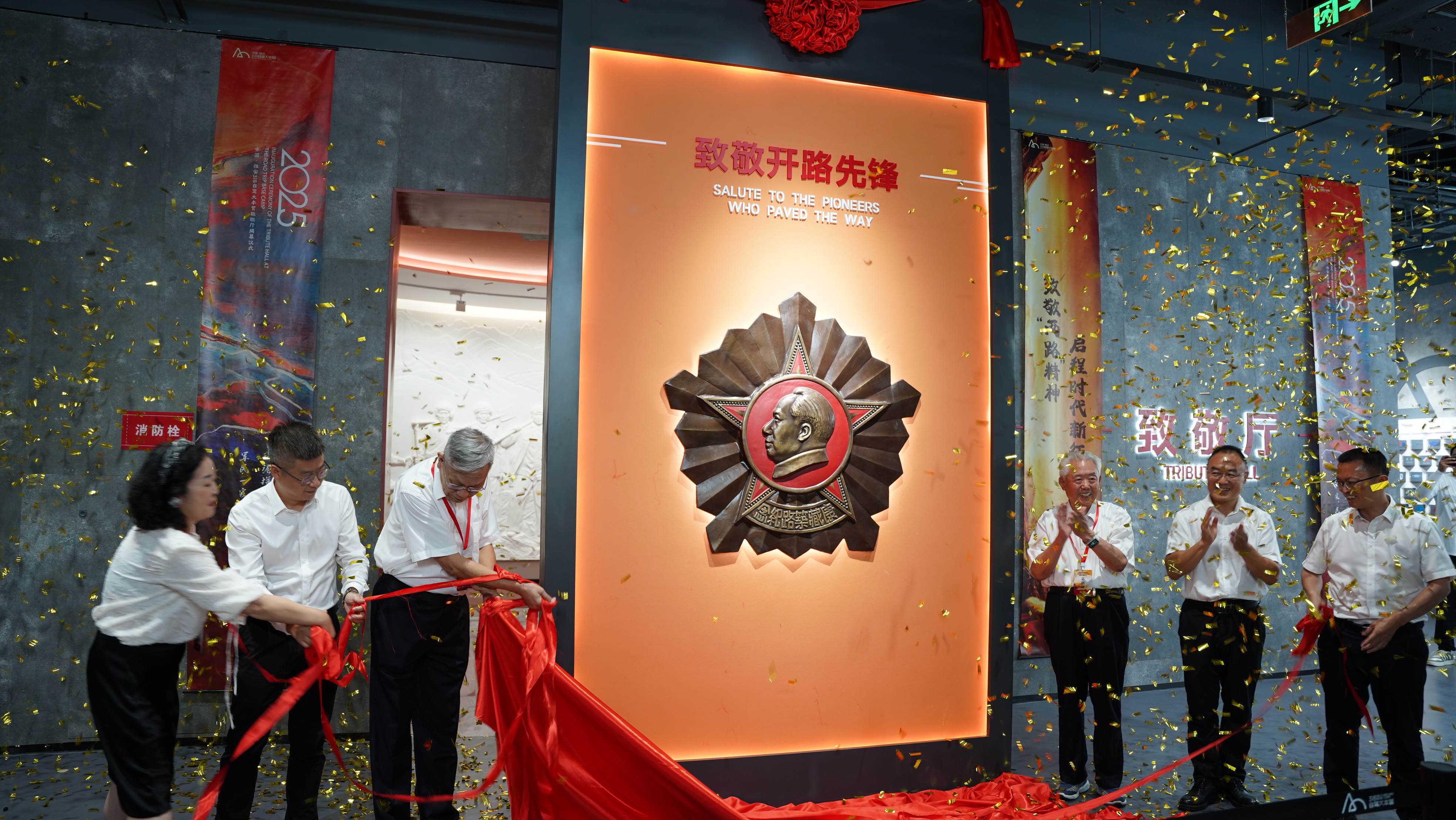 拉下红布的一瞬间,金色彩带和纪念徽章墙体的颜色交相辉映,“康藏天路·精神永续”致敬厅出现在眼前。