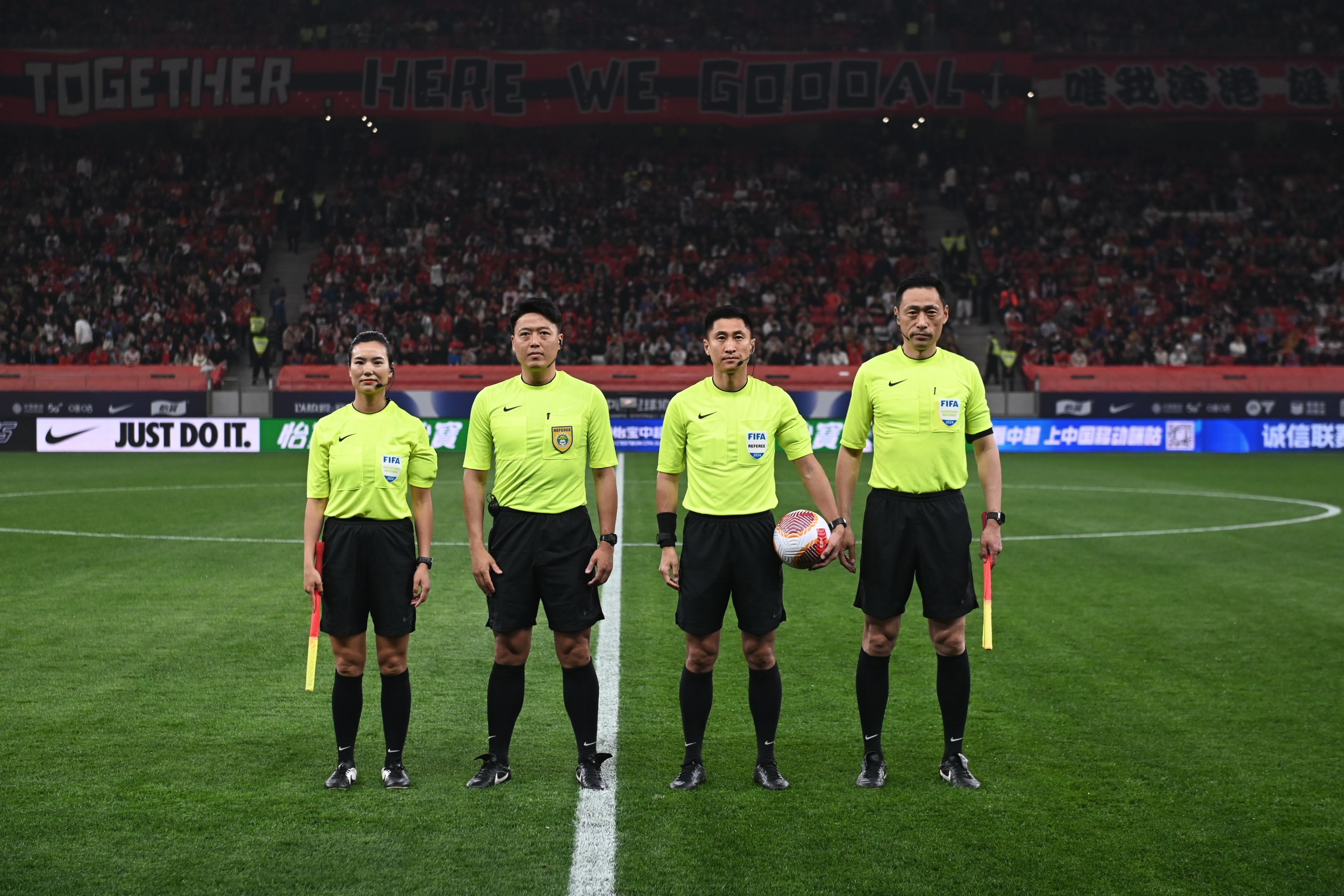 4月14日,主裁判马宁(右二)、第一助理裁判员施翔(右一)、第二助理裁判员谢丽君(左一)与第四官员万涛在比赛前。新华社发