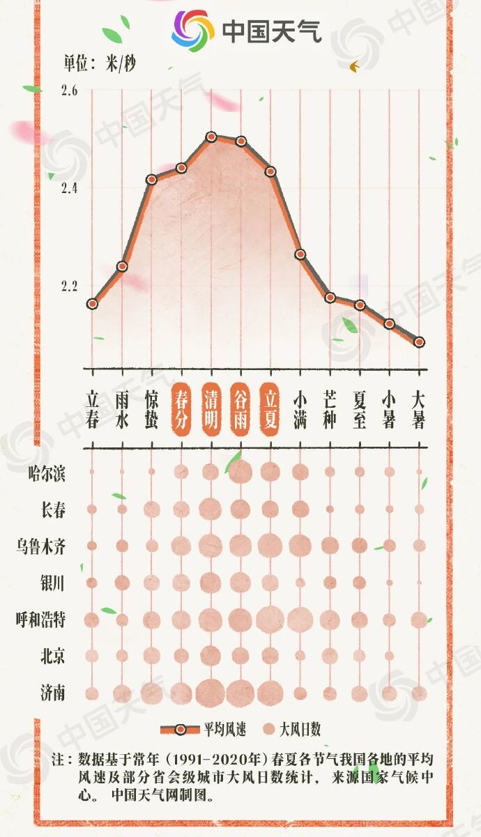 中国天气网大数据统计发现,我国春季出现大风的概率最高,尤其以4月最为突出。而清明正是一年中风最大的节气,全国平均风速能达到2.5米/秒左右。