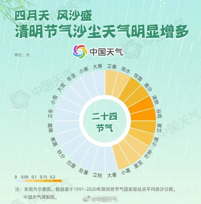 同时统计了全国2463个国家级气象站各节气的扬沙日数发现,春季是扬沙日数最多的季节,惊蛰到立夏这一段时间沙尘天气明显增多,尤其是清明到谷雨节气达到顶峰,扬沙日数甚至能达到夏秋时节的8倍之多。