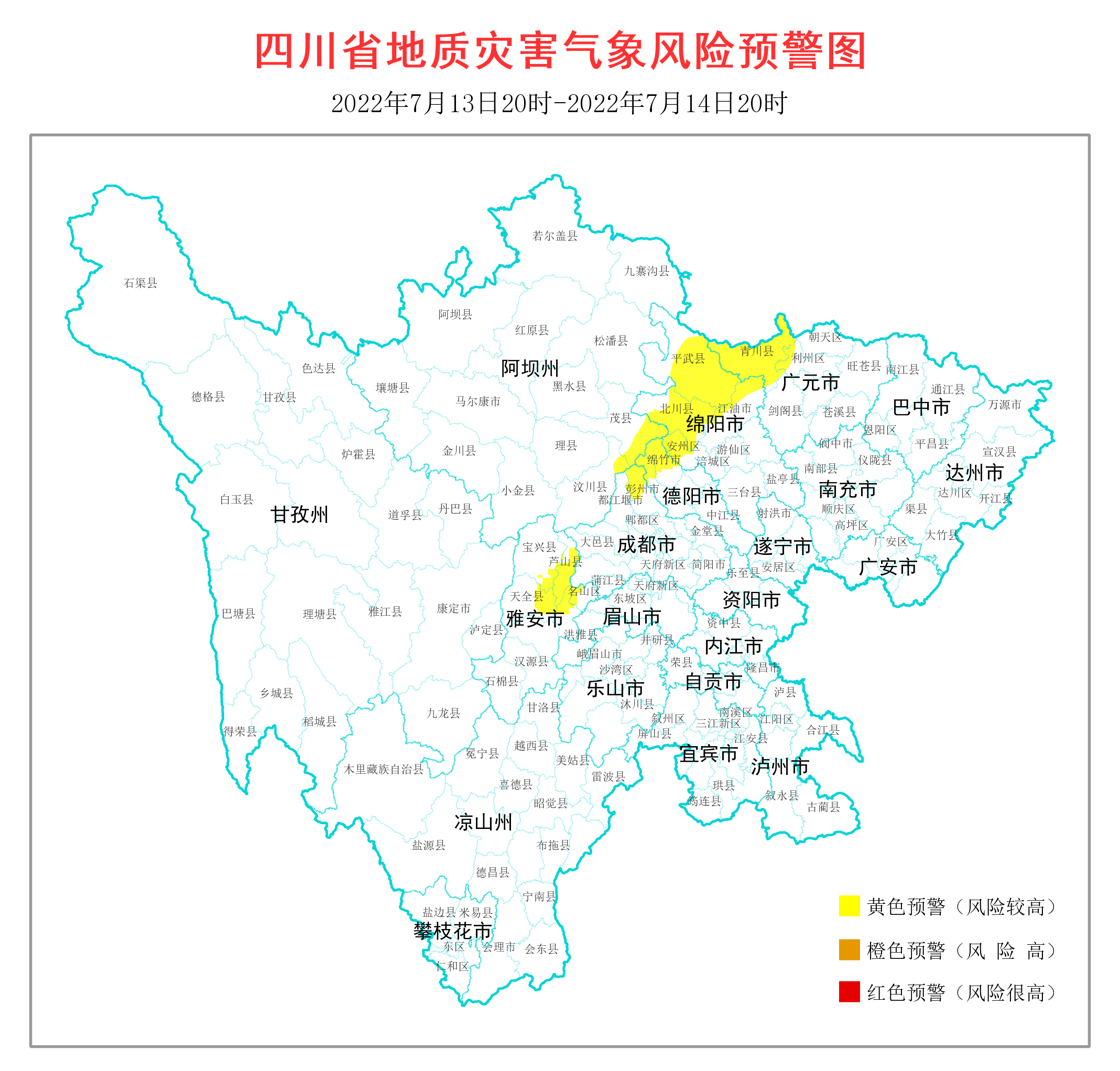 根据四川省地质环境条件,结合四川省气象台天气预报情况,四川省地质灾害指挥部办公室发布消息,7月13日20时至7月14日20时,全省部分地区有地质灾害气象风险3级黄色预警。