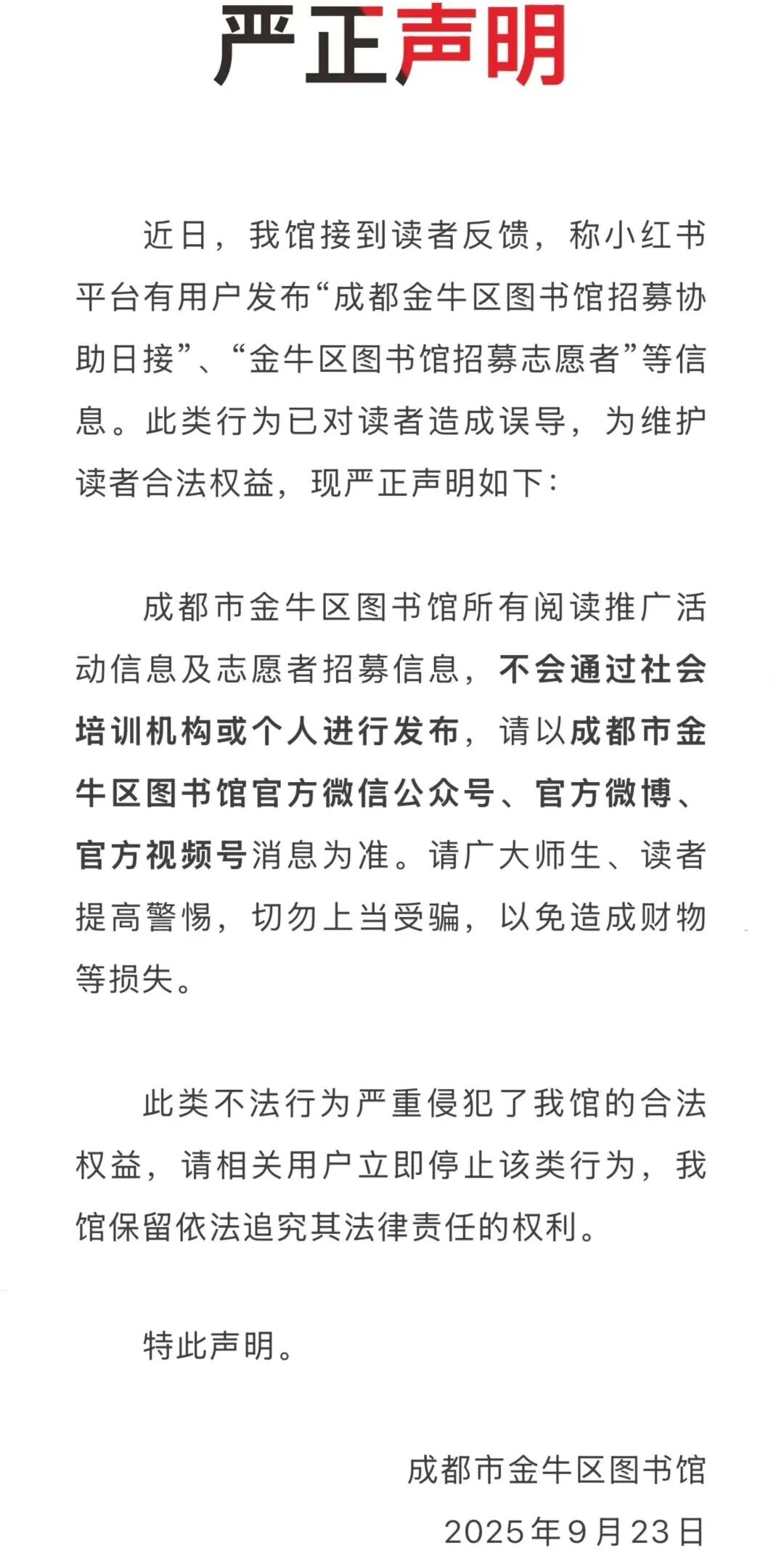 9月23日,成都市金牛区图书馆发布声明称,成都市金牛区图书馆所有阅读推广活动信息及志愿者招募信息,不会通过社会培训机构或个人进行发布,请以成都市金牛区图书馆官方消息为准。并提醒广大师生、读者提高警惕,切勿上当受骗,以免造成财物等损失。
