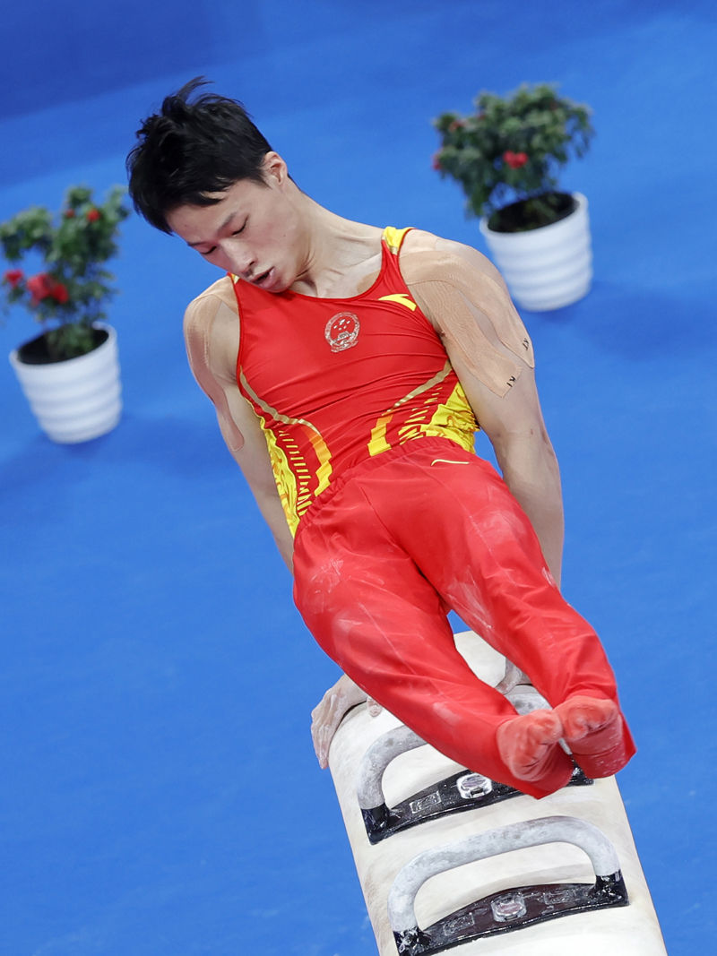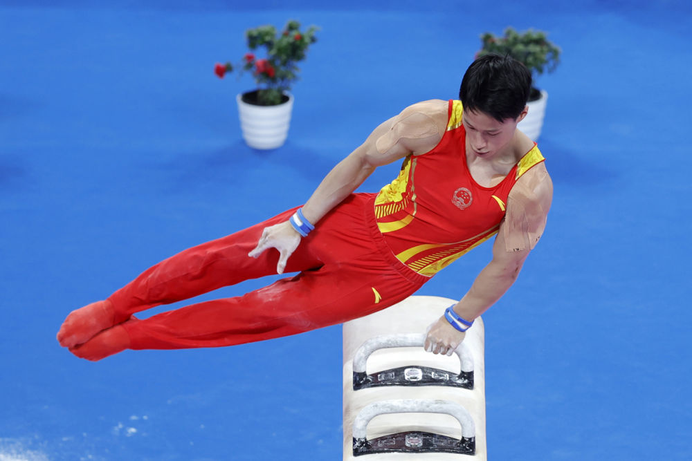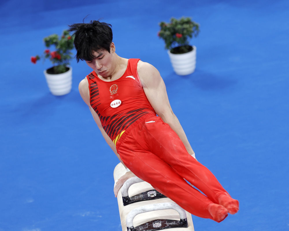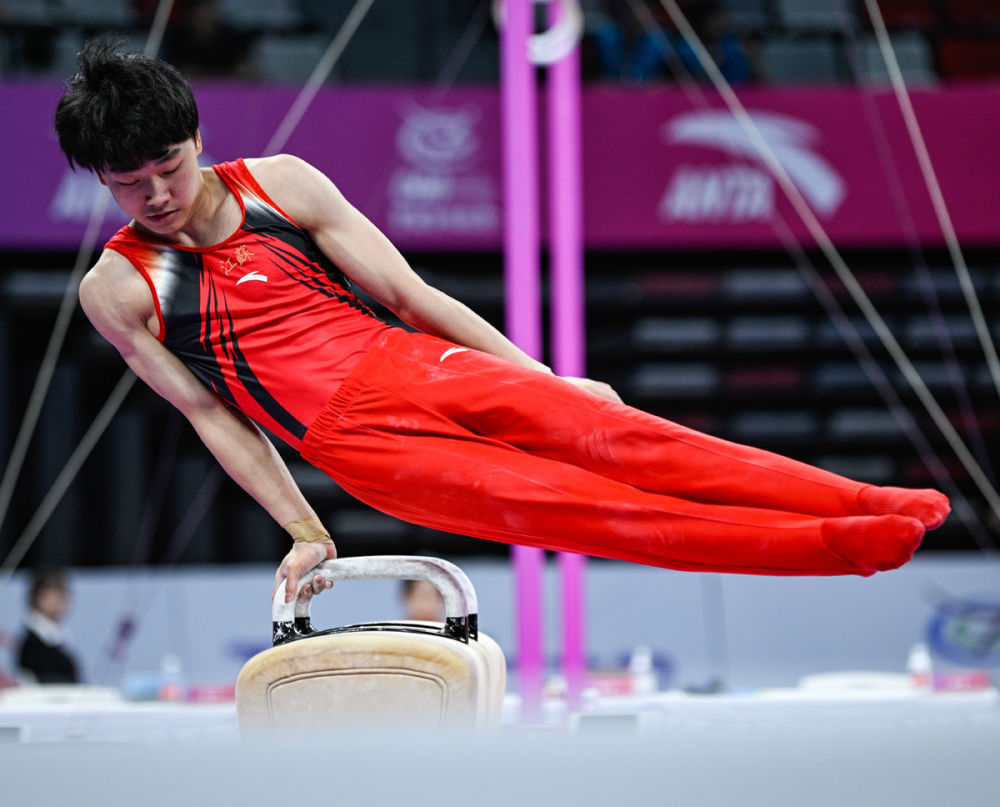 ↑4月14日,湖南队选手张博恒在鞍马决赛中。最终他以14.566分的成绩夺得亚军。新华社记者 王曦 摄