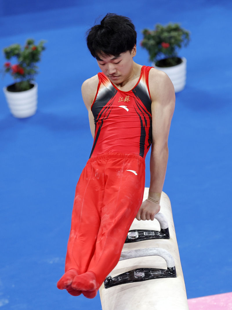 ↑4月14日,江苏队选手尹德行在鞍马决赛中。最终他以14.600分的成绩夺得冠军。新华社记者 沈伯韩 摄