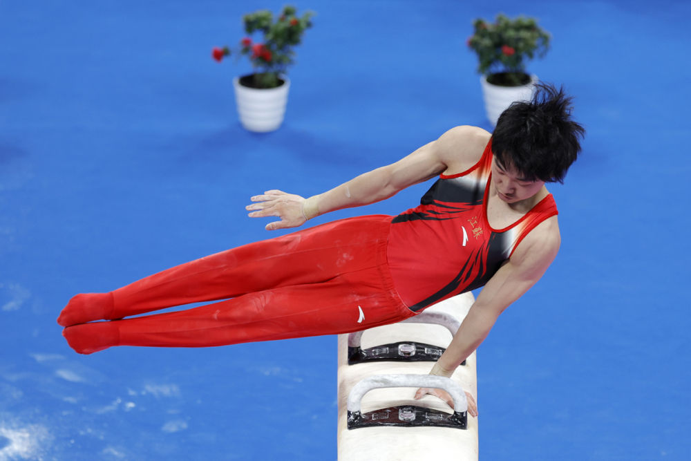↑4月14日,湖南队选手张博恒在鞍马决赛中。最终他以14.566分的成绩夺得亚军。新华社记者 沈伯韩 摄
