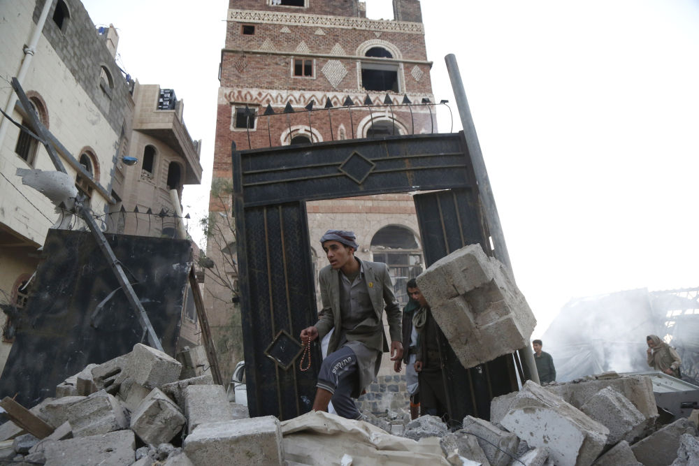 3月20日,在也门首都萨那,人们聚集在遭美军空袭的建筑附近。新华社发(穆罕默德·穆罕默德摄)