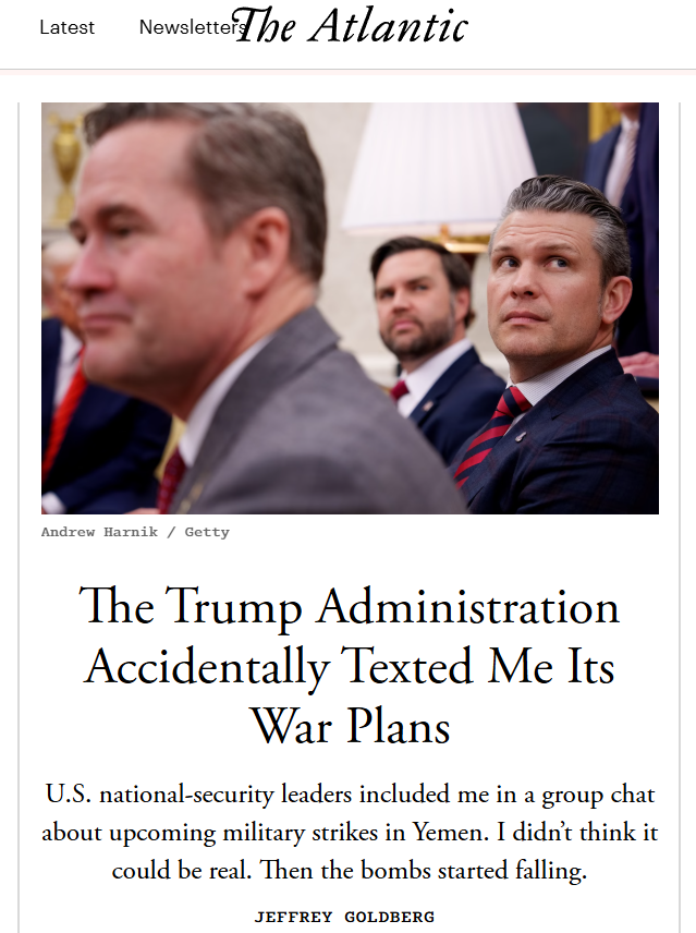 戈德堡在《大西洋》月刊24日发表的文章中详细叙述了事件经过:3月11日,他在“信号”(Signal)信息应用软件收到一个名为“迈克尔·华尔兹”的用户发来的连接请求。迈克尔·华尔兹是美国总统国家安全事务助理,但戈德堡当时并不确定这是否为华尔兹本人的账号。