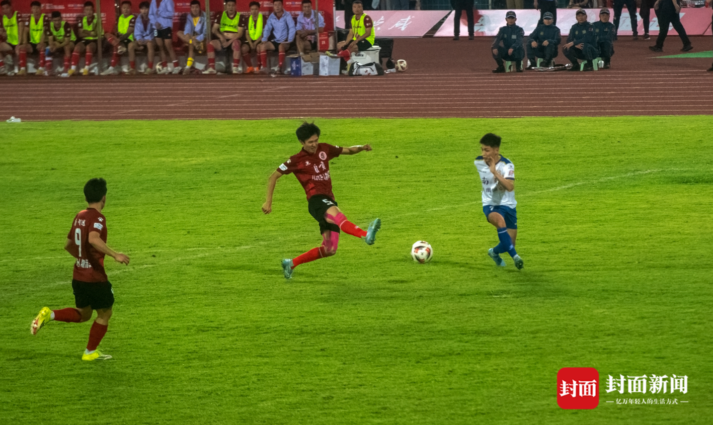 接下来的比赛,双方互有攻守,就在大家以为自贡又将在主场收获“四连平”的尴尬记录时,自贡队的邹睿、张乐涛两名球员站了出来——第85分钟,自贡队距球门约35米开外获前场任意球,23号邹睿站在球前,目光坚定,标志性地后撤几步,助跑,起左脚兜出一道美妙的弧线,皮球直奔球门左上角,“球进啦!”全场现众对这记“世界波”惊呆了,“这是9块9可以看到的球吗?”“此球只应天上有!”现场解说更是满屏赞美之辞!