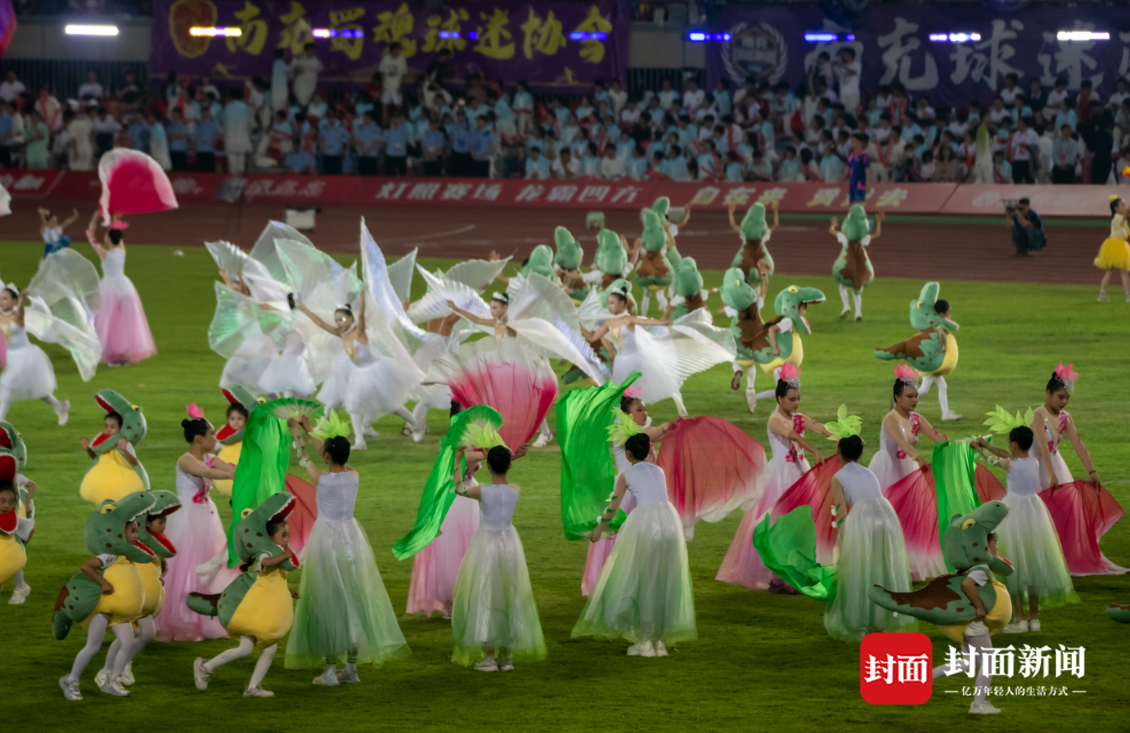 春启巴蜀,风拂盐都——展演在《染春・小马踏歌》中拉开序幕,啦啦操与非遗扎染方阵登场,活力跳跃与飘带翻飞相呼应,演绎丙午赤马一往无前之姿,尽显青少年蓬勃生长之貌;一针一线藏匠心,一染一浸传温情——《盐韵扎染》以灵动之姿铺展非遗长卷,蜀光绿盛332名学子化身为流动的色彩信使,以肢体语言讲述扎染非遗传承故事。学子们演绎从素白坯布到绚烂华章的蜕变。一个“染”字,将自贡盐都匠心与千年扎染文脉凝于川超舞台;压轴出场的是《盐绸共舞 绿茵争锋》,由富顺二中600名学子演绎,串联起千年盐都底蕴与千年绸都文化,致敬双城文化根脉,寓意两地团结共进。