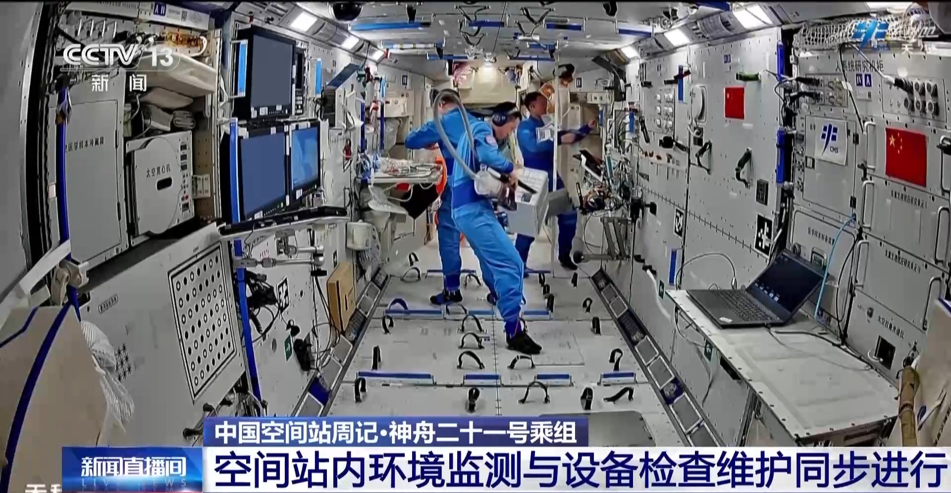 空间站内环境监测与设备检查维护同步进行。三名航天员使用相关仪器设备完成舱内空气洁净度测试、声环境监测。对饮水分配器、再生生保系统设备进行检查维护,并定期整理舱内物资、转移存放废弃物,保持站内的环境整洁。