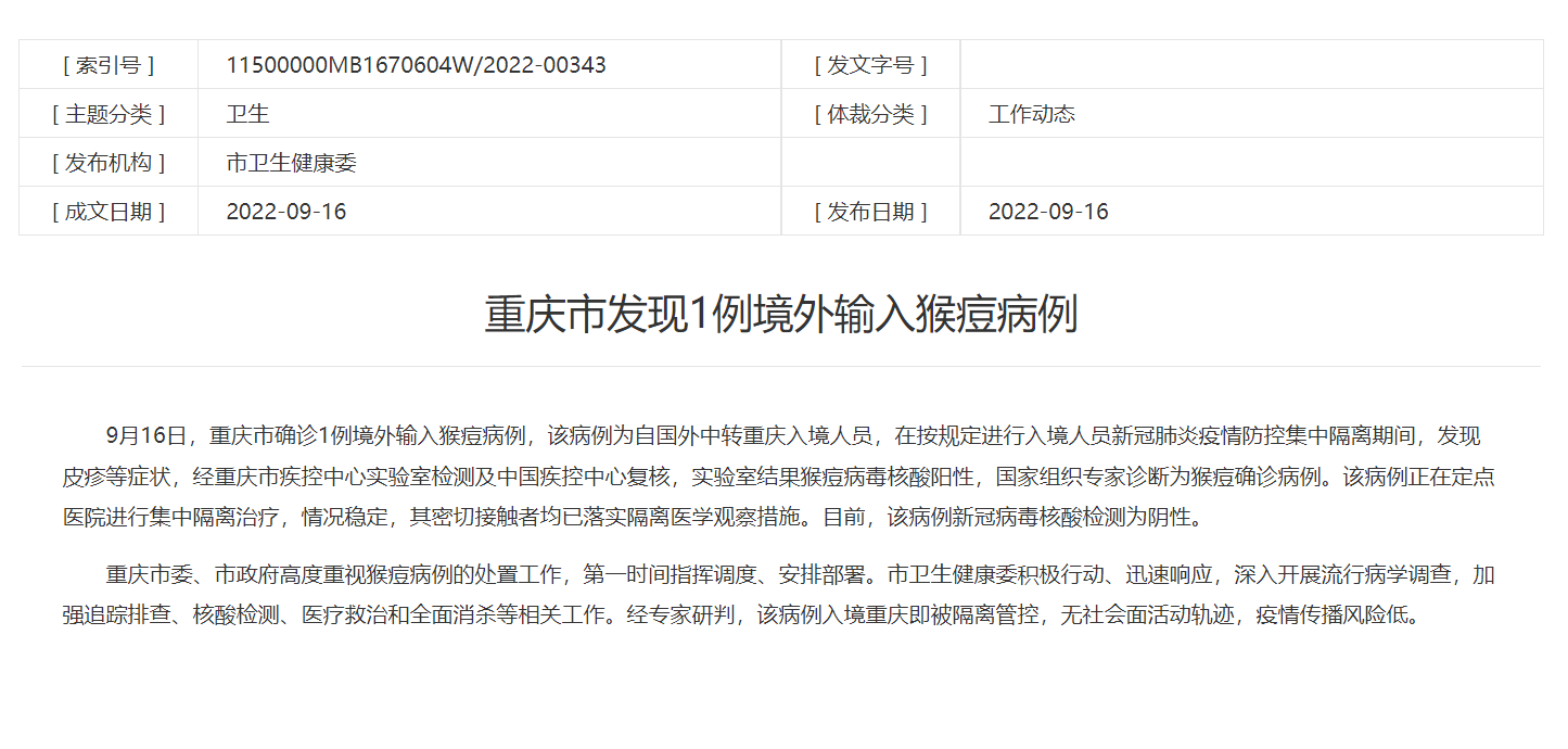 9月16日下午,重庆市卫生健康委发布信息称,重庆确诊1例境外输入猴痘病例。