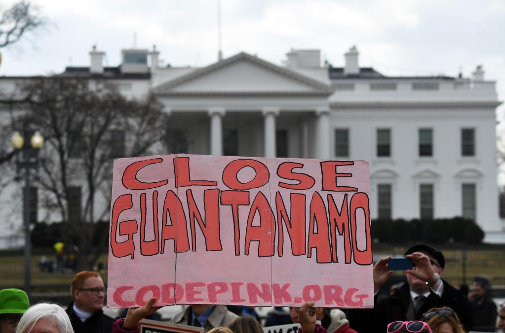 2018年1月11日,人们在美国华盛顿白宫外参加抗议活动,要求关闭关塔那摩监狱。该监狱用以关押“9·11”事件后美军在全球反恐行动中抓获的嫌疑人,因多次传出虐囚丑闻而臭名昭著。新华社记者殷博古摄
