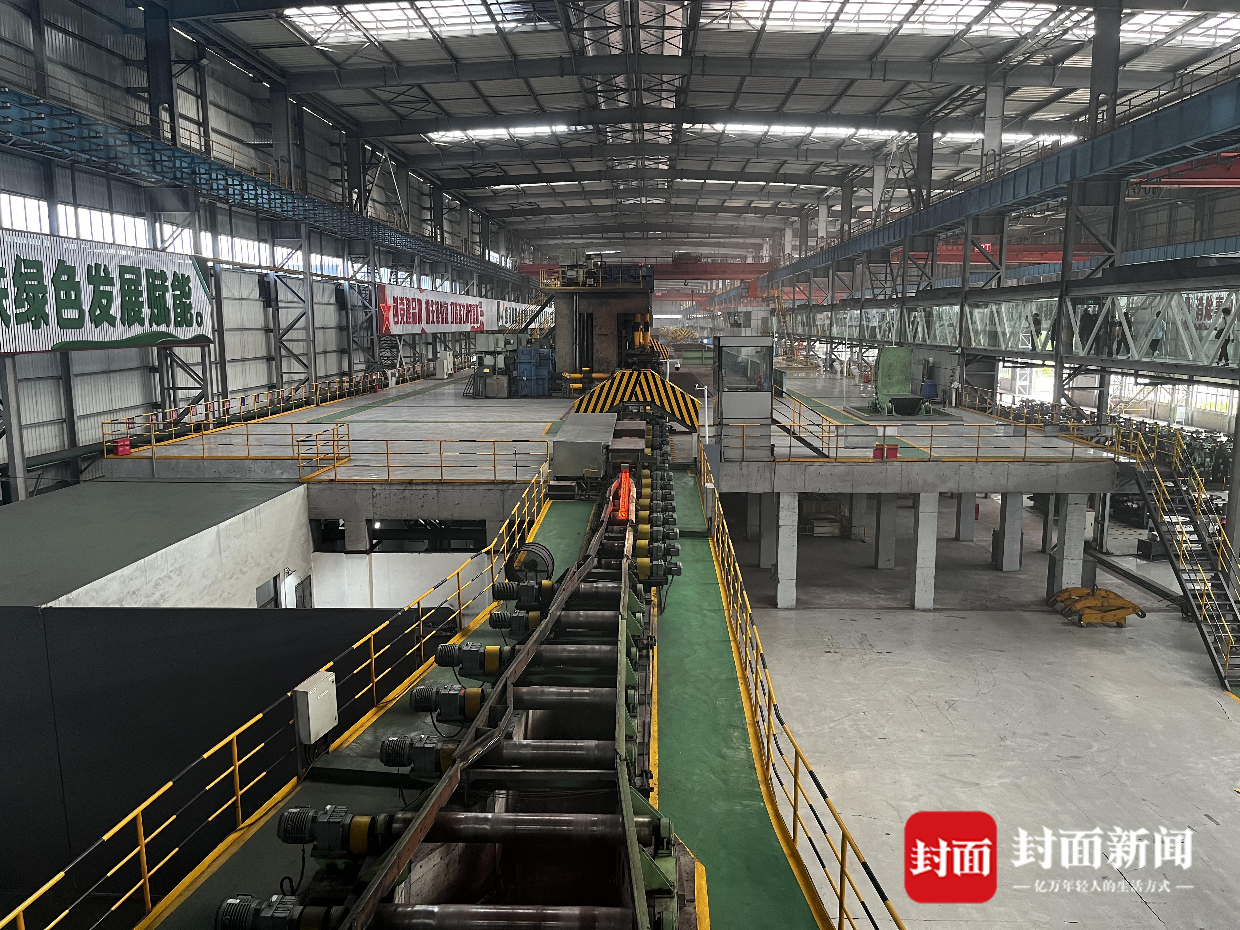 烧红的钢胚被传送出来