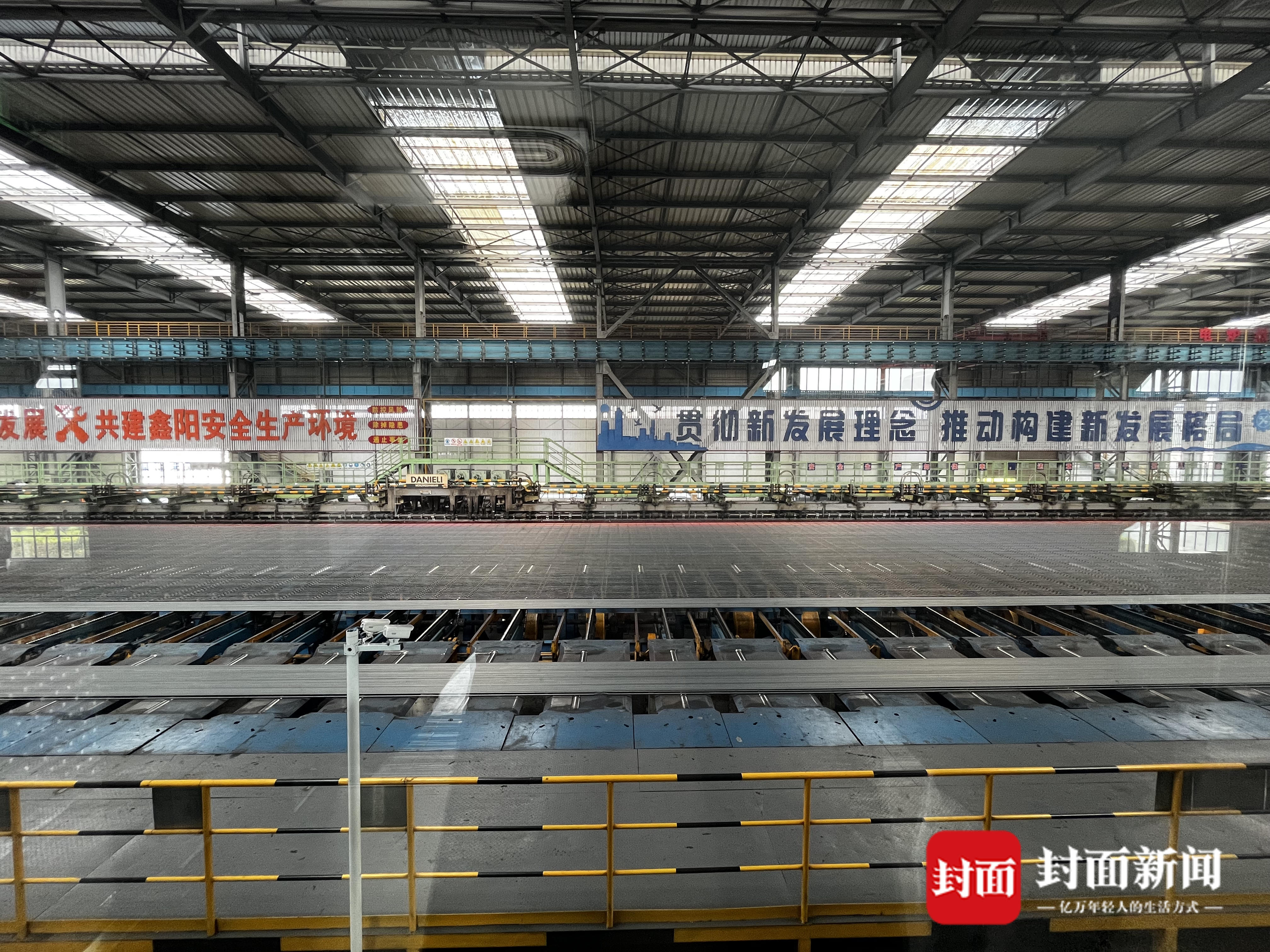 行进在长长的生产线参观通道内,记者看到通红的钢坯被送到生产线上,通过多个程序被剪切成长条状的螺纹钢,整个过程高效快捷。