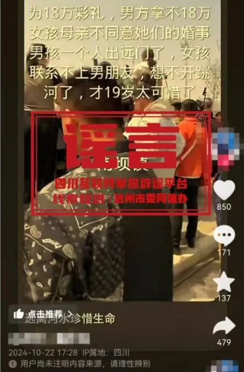 10月22日,网上出现群众聚集围观视频,并配文称,南坝镇一女孩因男方拿不出18万彩礼,女方家人不同意其婚事,男方一个人出远门,女孩无法联系男友而跳河。宣汉县委网信办第一时间组织宣汉县公安局和南坝镇政府调查核实,经核查,该信息为谣言,请广大网民不信谣、不传谣。