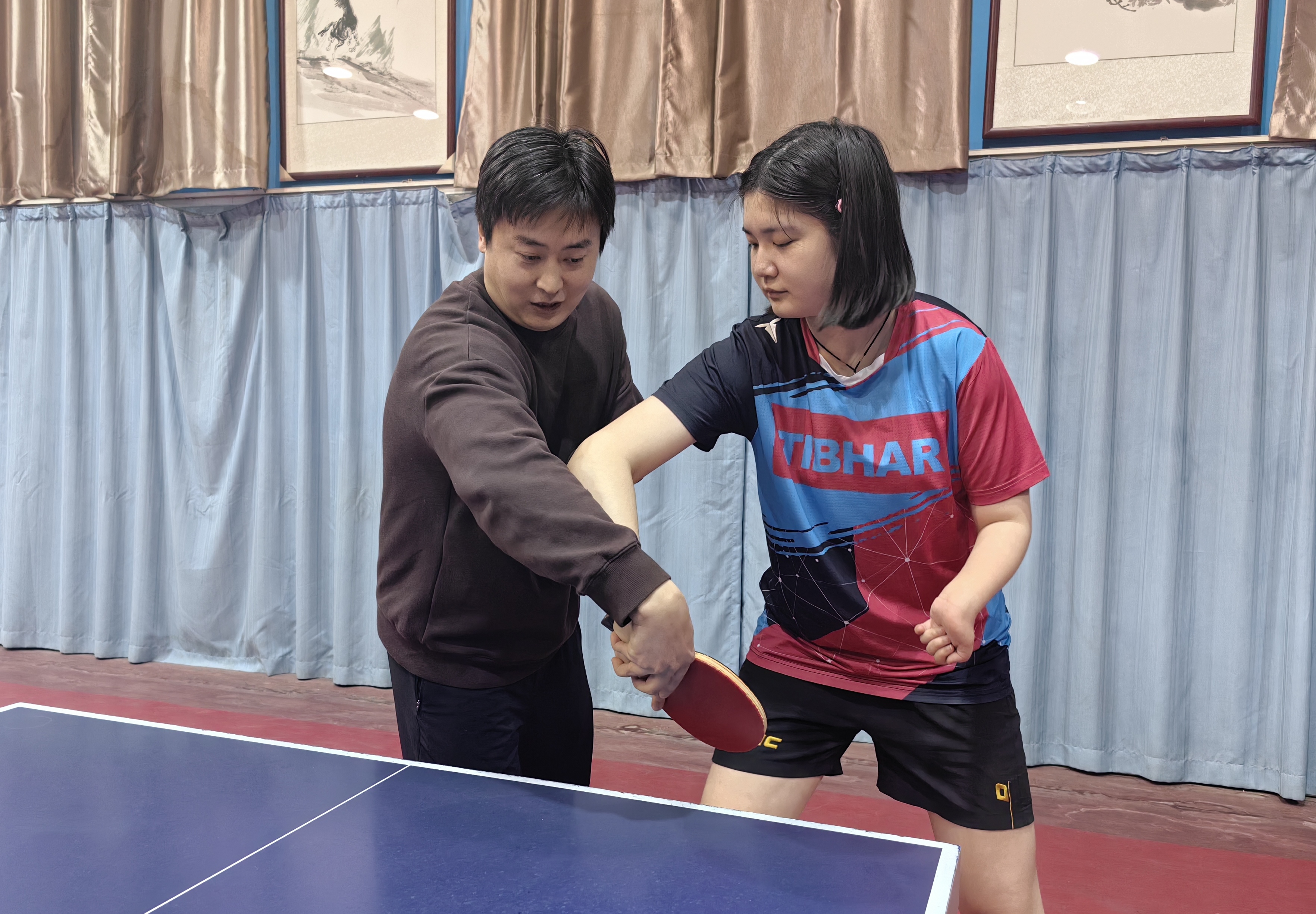 山东省残疾人乒乓球运动员冬日集训现场,集训教练、山东师范大学体育学院教师齐伟(左)在辅导运动员霍欣冉的发球姿势。新华社记者 张力元 摄