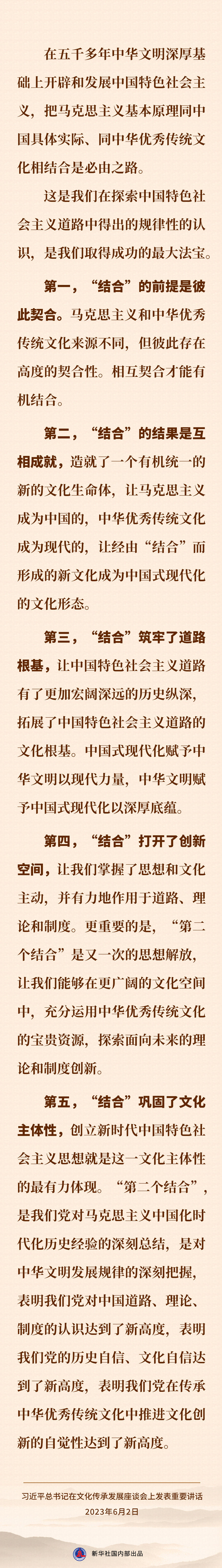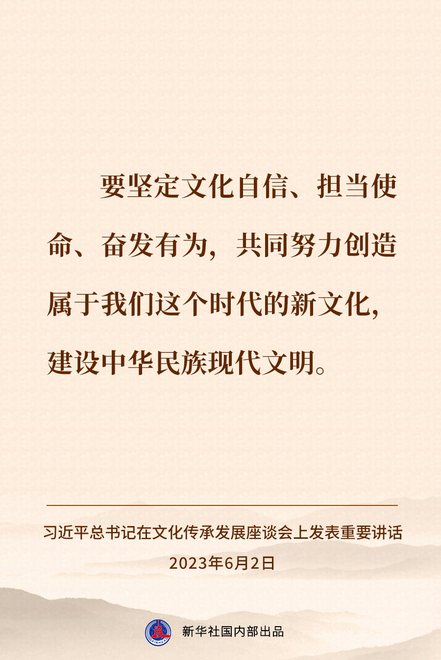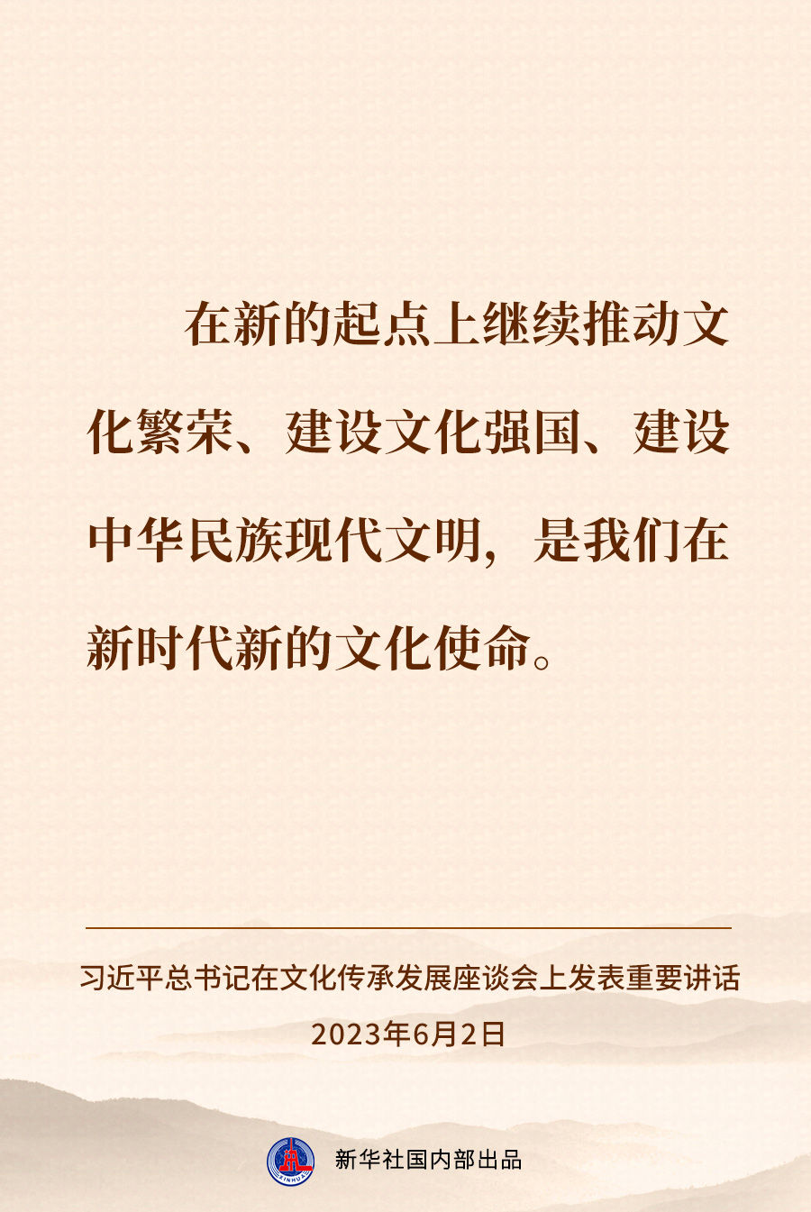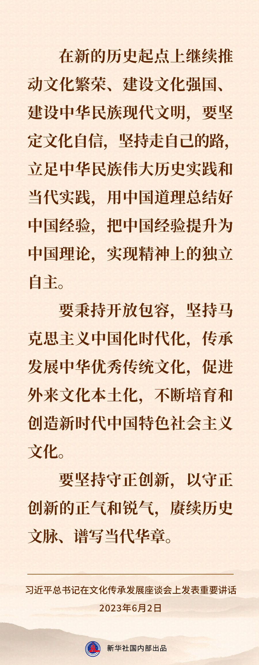 担负起新的文化使命 努力建设中华民族现代文明——习近平总书记在文化传承发展座谈会上重要讲话速览 新华社 2023-06-03 08:18 149236 6月2日,习近平总书记在北京出席文化传承发展座谈会并发表重要讲话。一起来看讲话速览↓ 评论 0 还没有添加任何评论,快去APP中抢沙发吧! 我要评论
