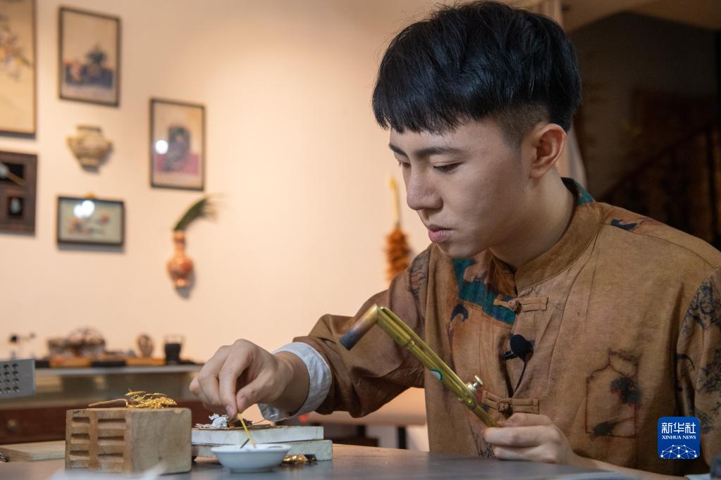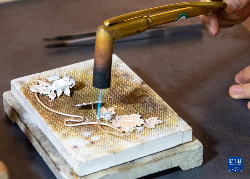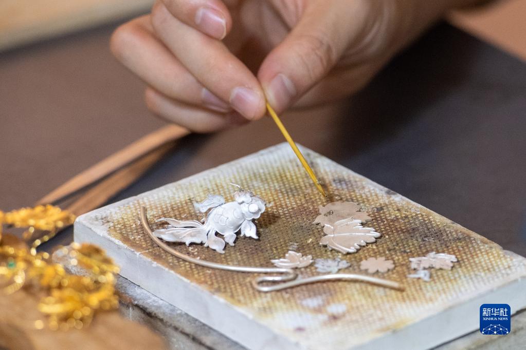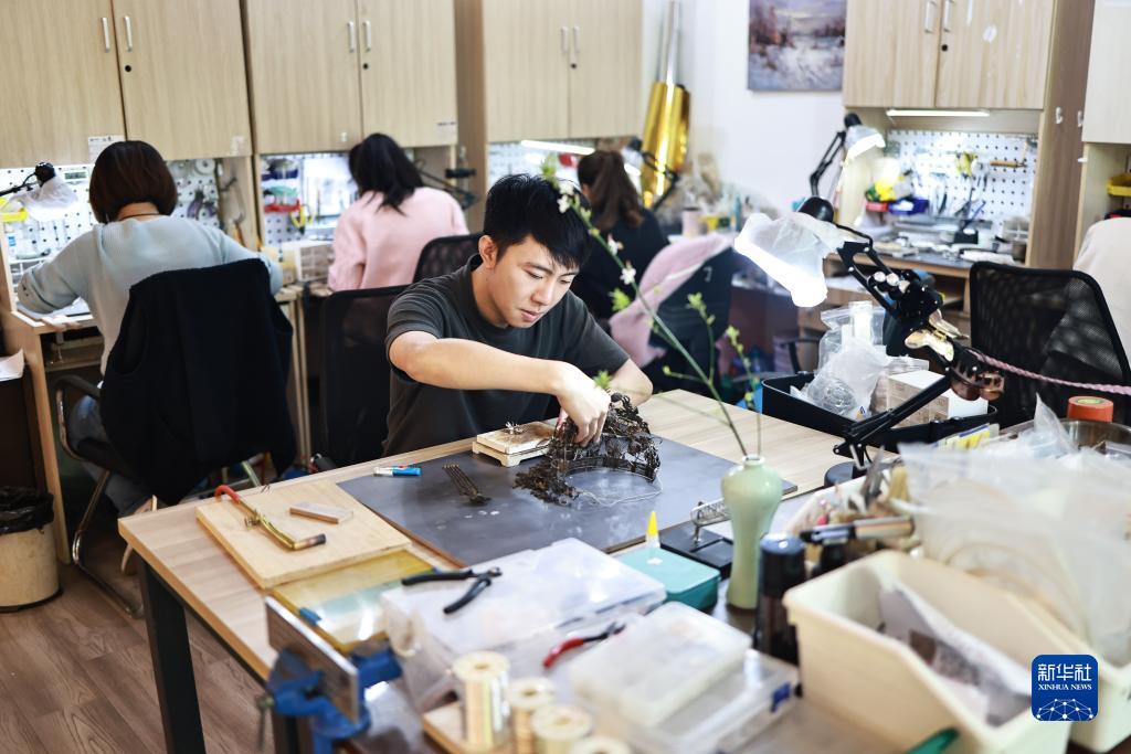 辜国强在制作花丝镶嵌作品(4月20日摄)。新华社发(苏志刚 摄)