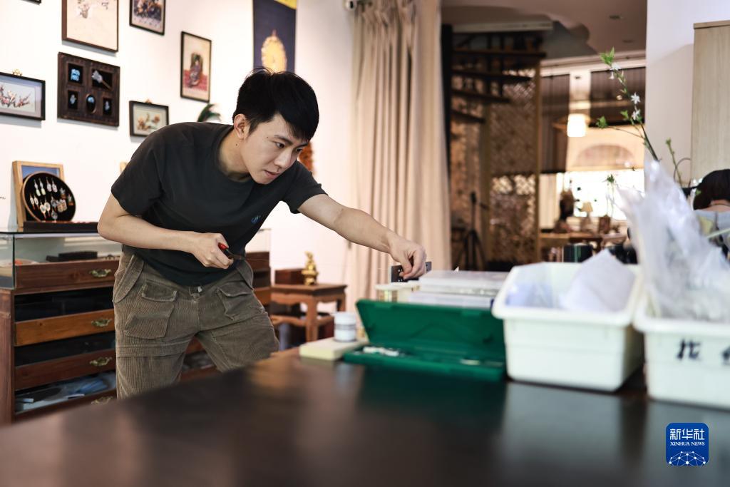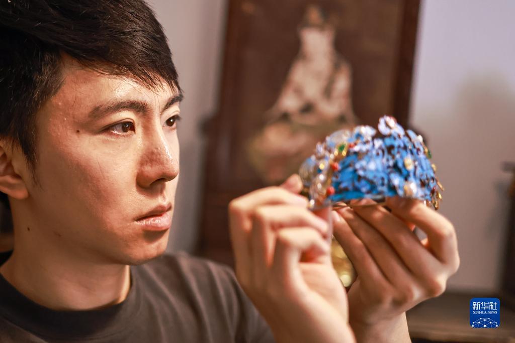 辜国强在摆放花丝镶嵌作品(4月20日摄)。新华社发(苏志刚 摄)