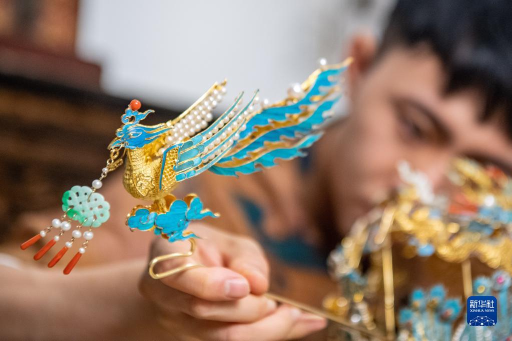 6月9日,辜国强在组装花丝镶嵌作品“凤引九雏”。新华社记者 唐奕 摄