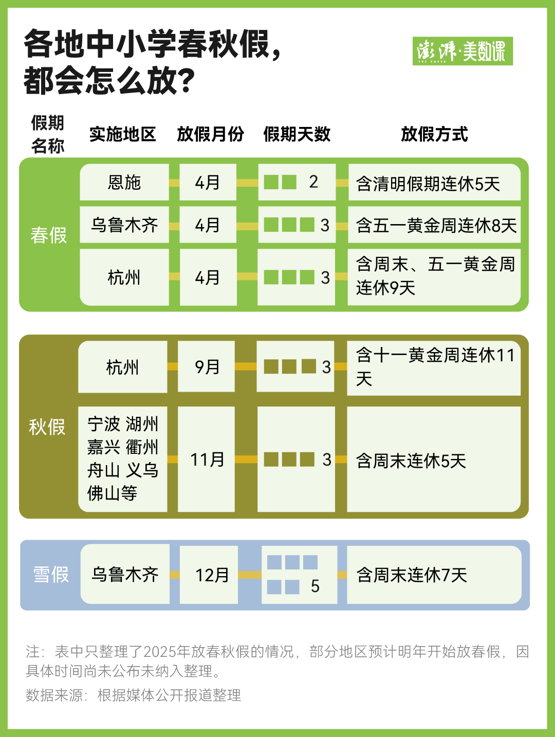 到了2025年,更多地方开始落实中小学生“春秋假”,其模式基本是与清明、五一、国庆等小长假连休。值得一提的是,乌鲁木齐市还在今年将12月1日至12月5日定为“雪假”,并为中小学生提供免费滑雪的机会。