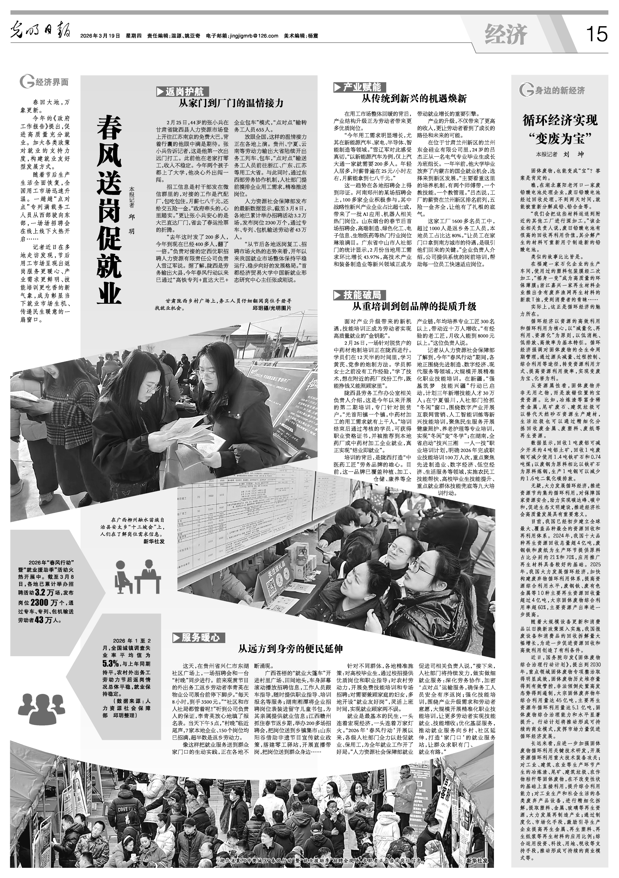 就业是最基本的民生,一头连着宏观经济,一头连着万家灯火。“2026年‘春风行动’开展以来,各级人社部门全力以赴促就业、保用工,为全年就业工作开了好局。”人力资源社会保障部就业促进司相关负责人说,“接下来,人社部门将持续发力,做实做细就业服务:深化劳务协作,加密‘点对点’运输服务,确保务工人员安全有序返岗;强化技能培训,围绕产业升级需求和劳动者意愿,大规模开展精准化职业技能培训,让更多劳动者实现技能就业、技能增收;优化基层服务,推动就业服务向乡村、社区延伸,打造‘家门口’的就业服务站,让群众求职有门、就业有路。”