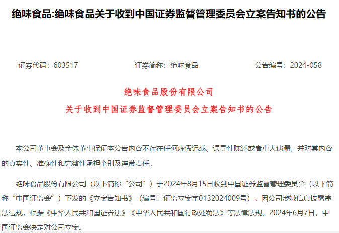 公告显示,绝味食品被指控涉嫌违反《中华人民共和国证券法》和《中华人民共和国行政处罚法》等相关法律法规。不过,公司表示目前各项生产经营活动仍在正常进行,立案调查期间将积极配合调查工作,及时履行信息披露义务。
