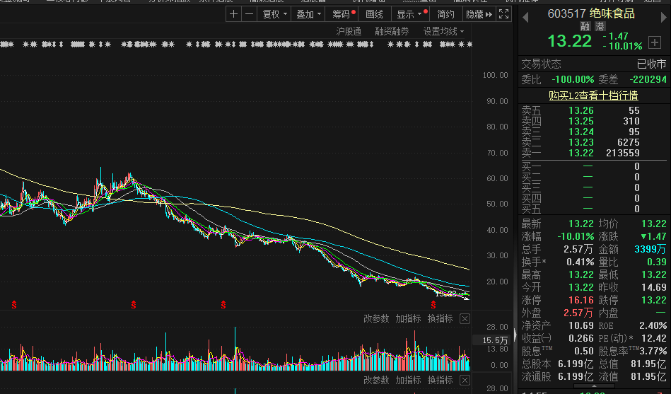 8月16日开盘后,绝味食品跌停,报13.22元/股。消息面上,8月15日,绝味食品公告,公司收到中国证监会下发的《立案告知书》,因公司涉嫌信息披露违法违规被立案。