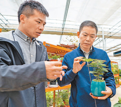 胡发炜(右)在红河谷农业园区查看盆栽生长情况。 本报记者 徐驭尧摄