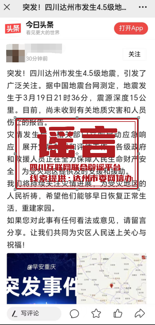 3月24日16时24分,某网民在今日头条平台发布信息称,3月19日21时36分,四川达州市发生4.5级地震,震源深度15公里。