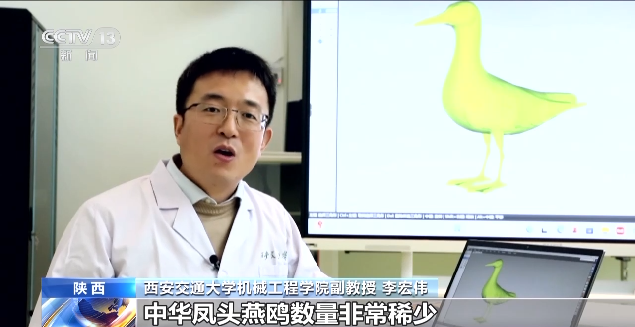 西安交通大学机械工程学院副教授 李宏伟:中华凤头燕鸥数量非常稀少,我们查找了大量的资料,发现它和鸽子在形态和体态上具有相似性。我们以鸽子为原型进行了初次的建模尝试,结合中华凤头燕鸥喙部、翅膀以及腿部和尾部的特征,进行了10多次的迭代,得到了和真实中华凤头燕鸥非常相近的三维数字模型。有了这个三维数字模型,我们就可以进行3D打印制造。
