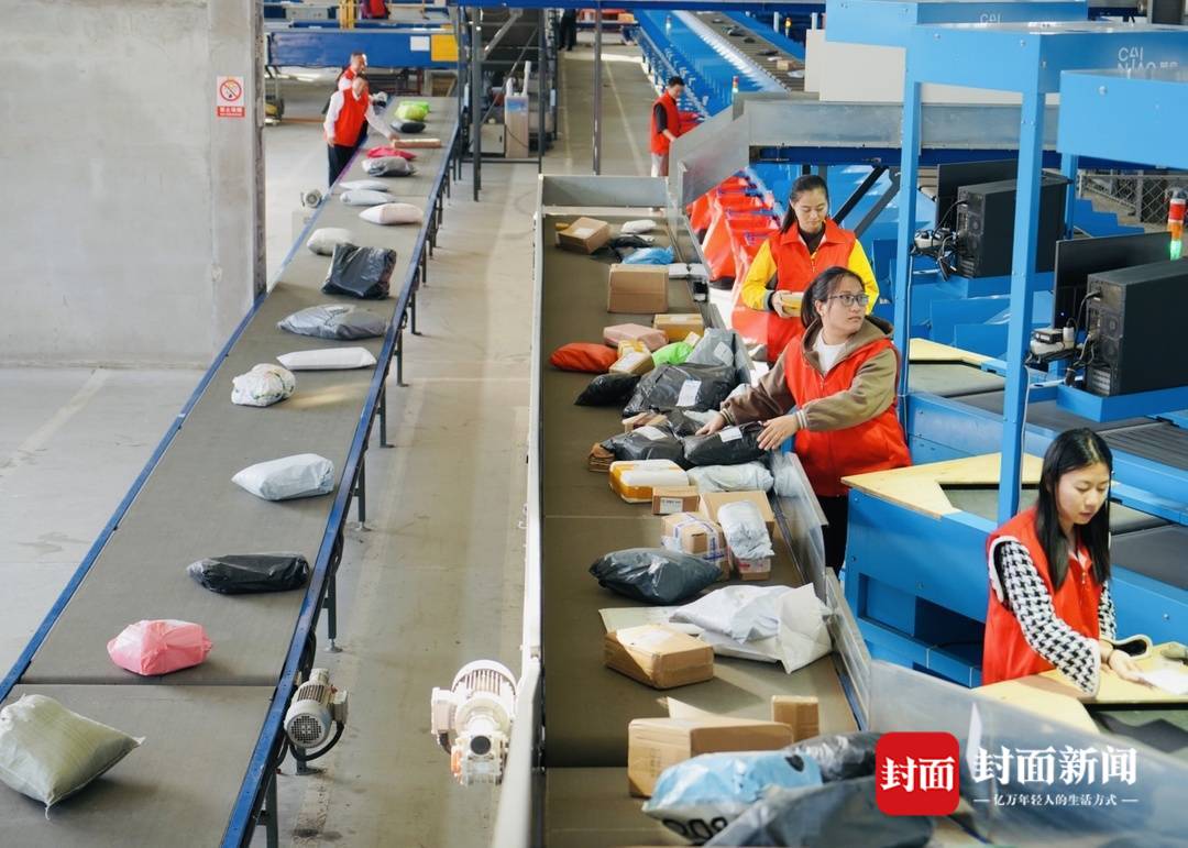 湖南汨罗一处“电商物流园”内,快递工作人员在整理包裹。摄影 封面新闻记者 卢荡