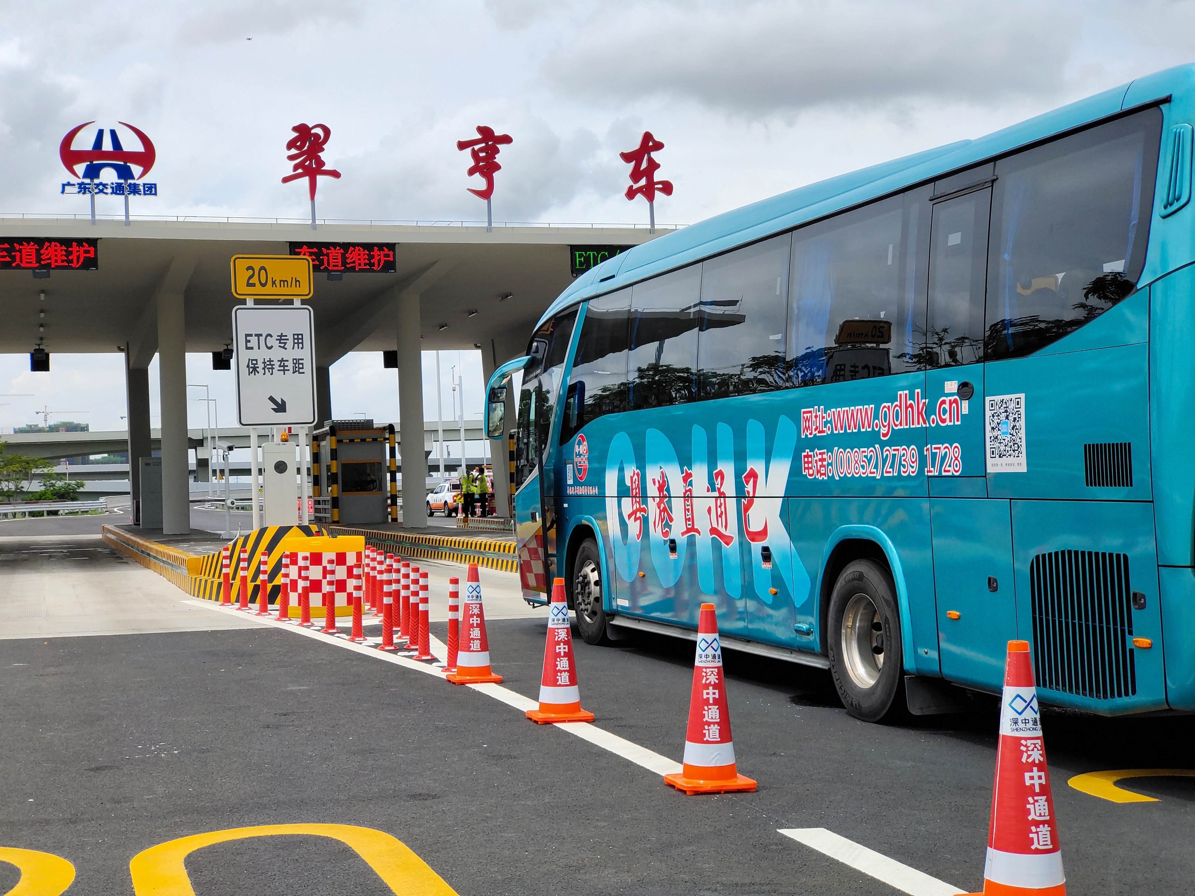 15时整,深中通道中山端的翠亨东收费站,在绿色的粤港直通巴士打头下,一辆辆大小车辆有序鱼贯通过收费站,稳稳驶上崭新宽阔的桥面,往深圳方向飞驰而去,宣告深中通道正式通车试运营。